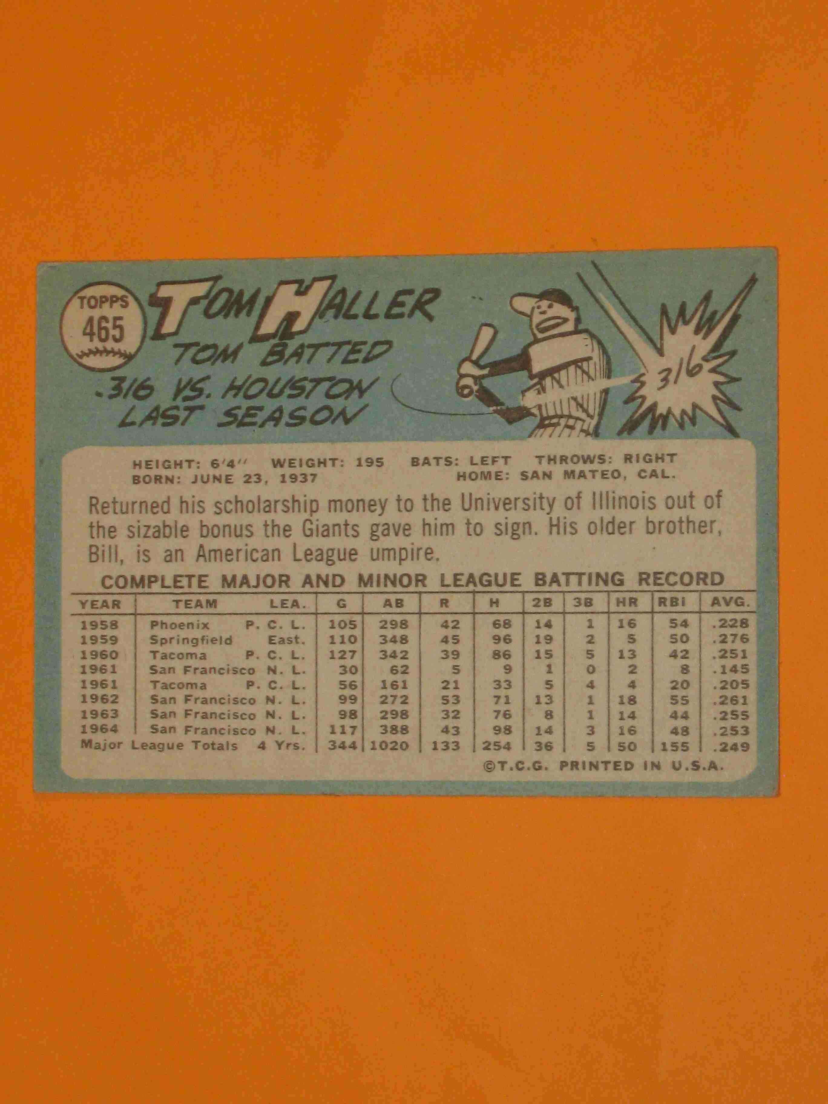 1965 Topps Tom Haller #465 San Francisco Giants HIGH#