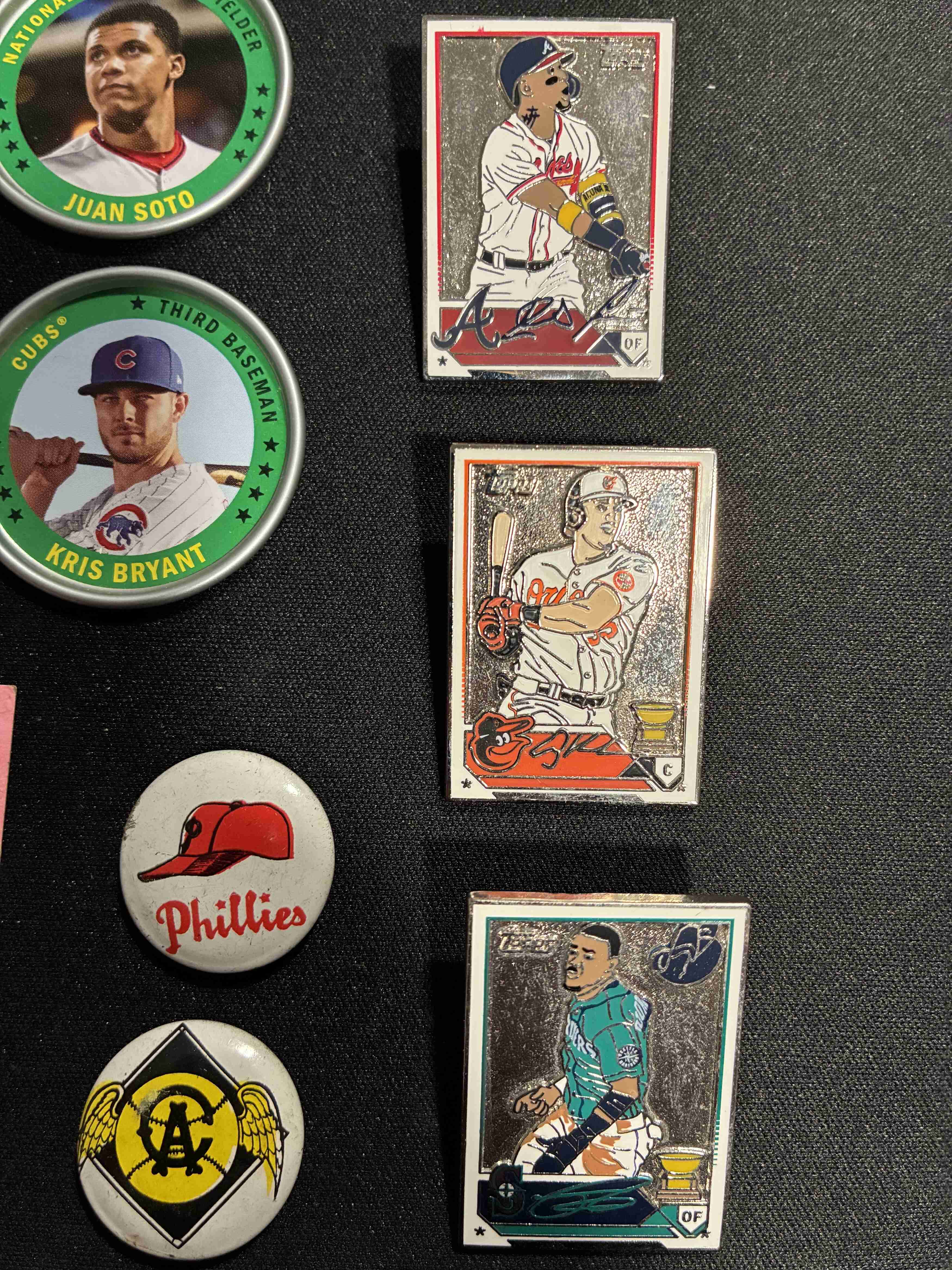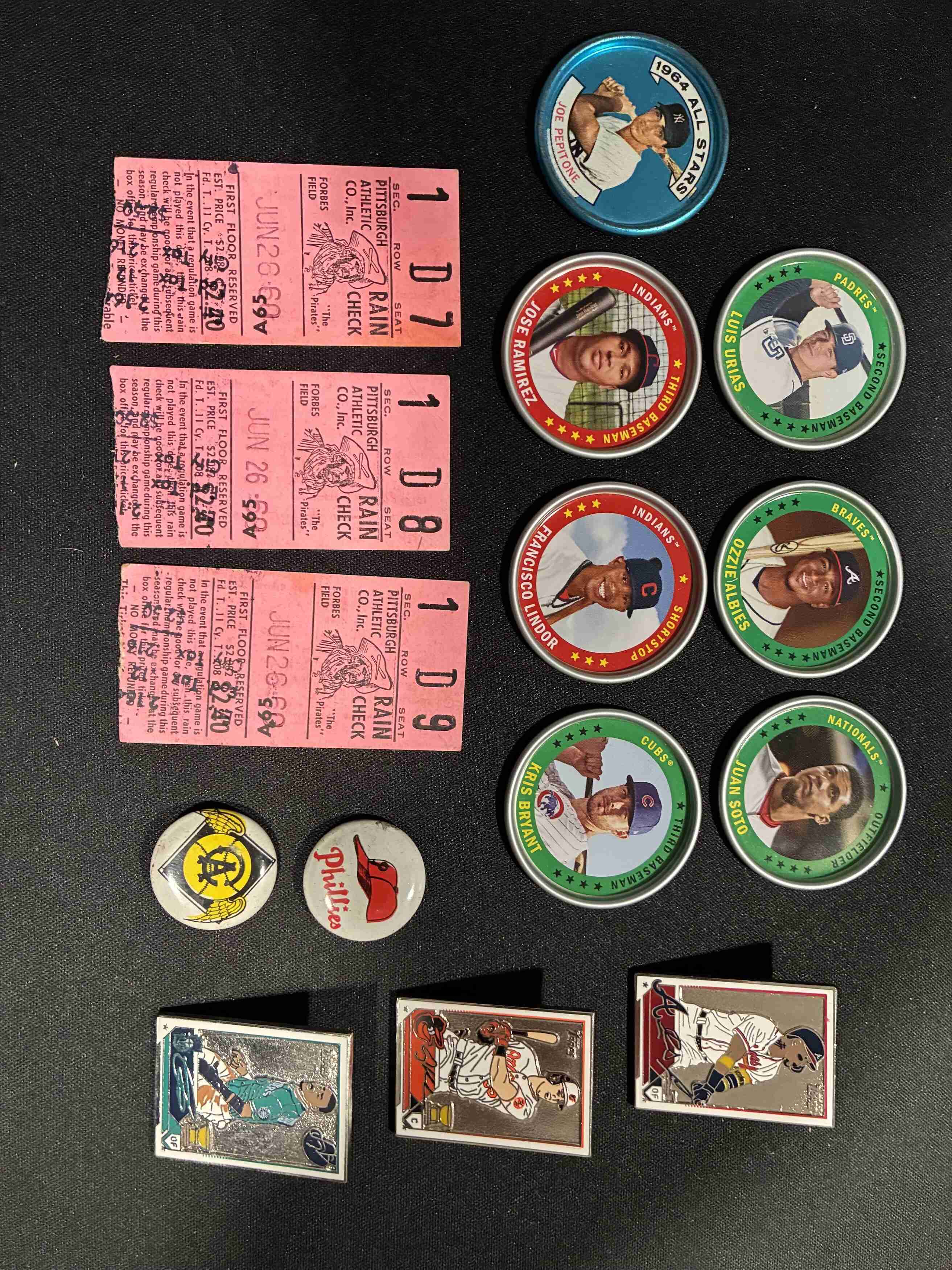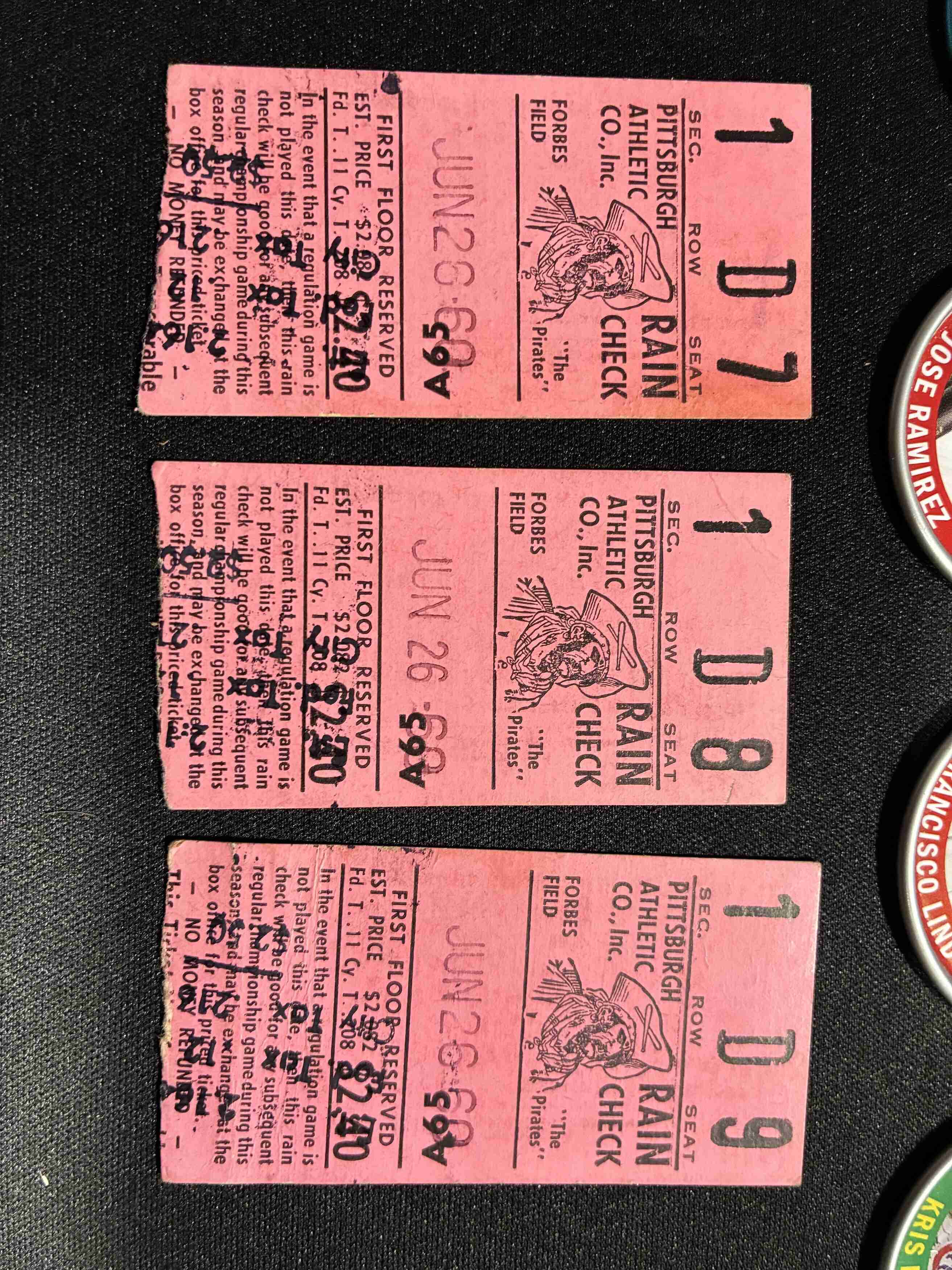 You are bidding on this random pin/button lot highlighted by 3 Pittsburgh Pirates tickets from 6/26/60, a game both Ernie Banks and Roberto Clement played in. You can find the boxscore below: https://www.baseball-reference.com/boxes/PIT/PIT196006262.shtml. You get everything pictured. Please ask any questions before bidding. Thank you.