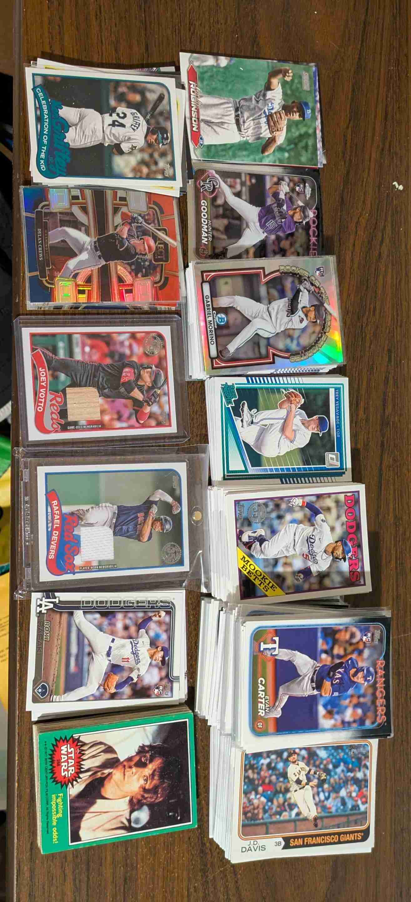 Lot of roughly 450 cards; mostly from 2023-2025....many rookies and some inserts including a Rafael Devers Jersey card and a Joey Voto Bat card. All baseball with the exception of 30 Star Wars cards from the late 70's/early 80's. Hoping someone will enjoy this box of randomness!