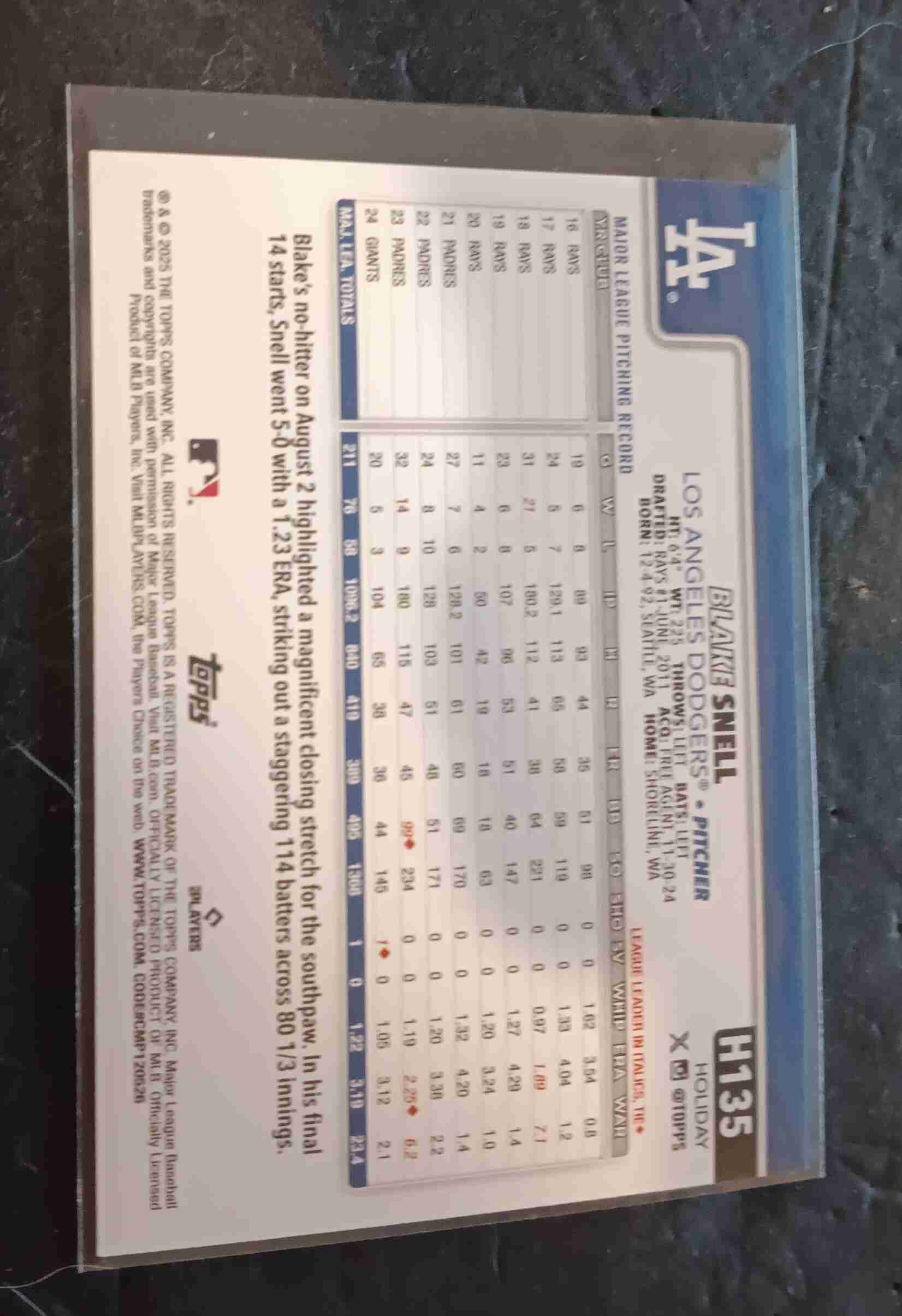 This auction is for a 2025 Holiday Blake Snell Blue Metallic Glitter Parallel.Card is number H135,and is in NM condition.Thanks for looking.