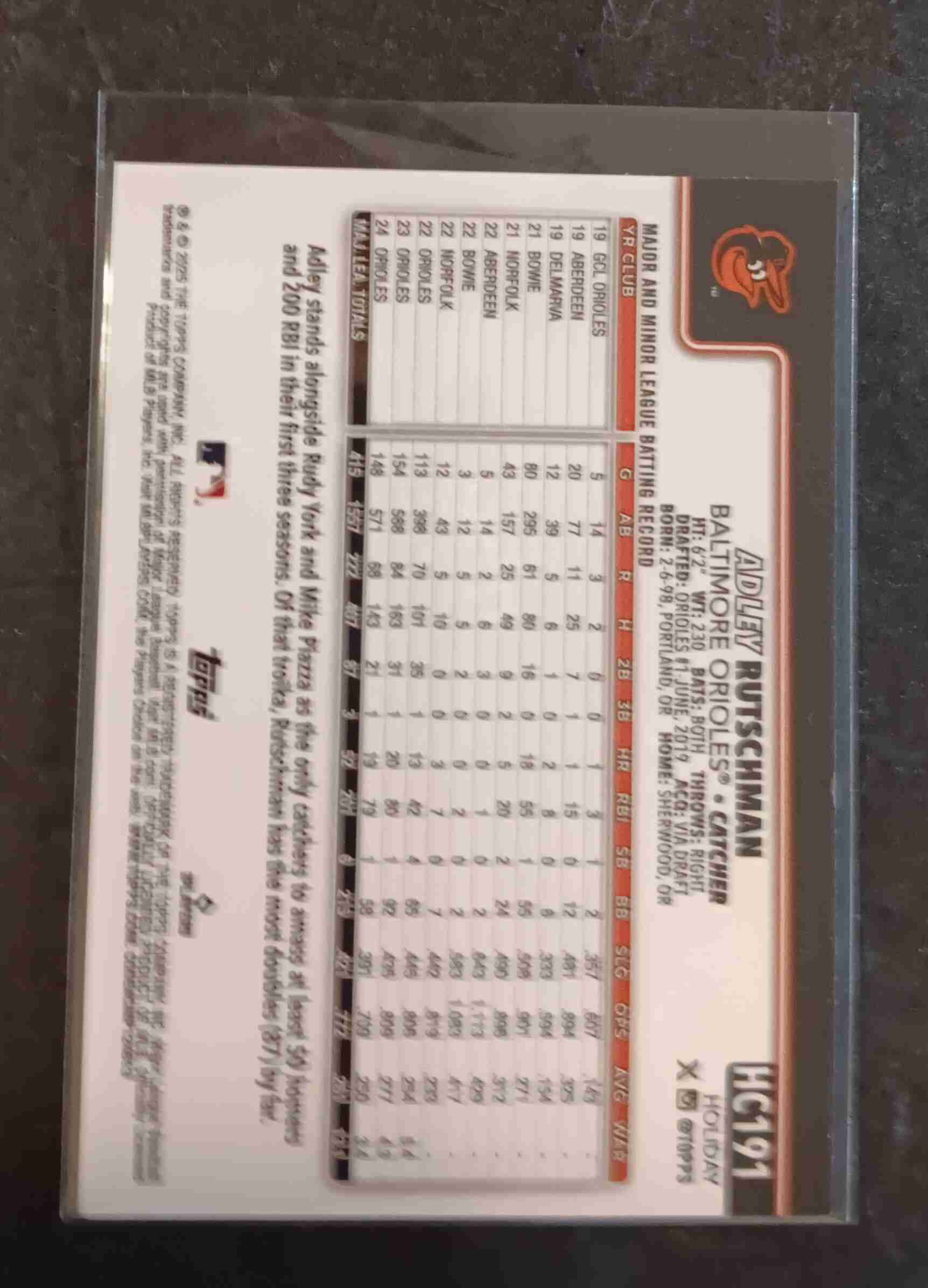 This auction is for a 2025 Topps Holiday Adley Rutschman Chrome Refractor,numbered #/499.Card is numbered #H191,and is in NM condition.Thanks for looking.