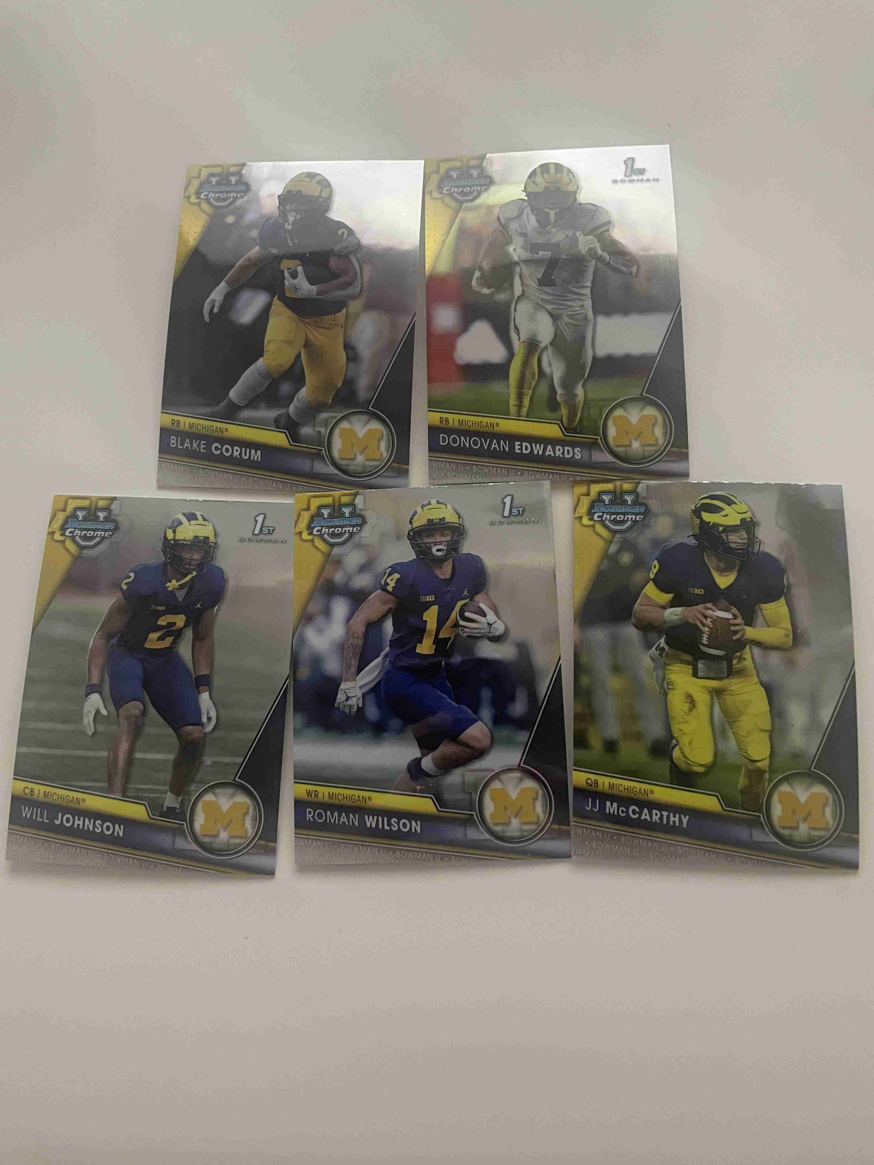 5 Michigan cards from the set. Will Johnson 1st Bowman Blake Corum Donovan Edwards 1st Bowman Roman Wilson 1st Bowman JJ McCarthy