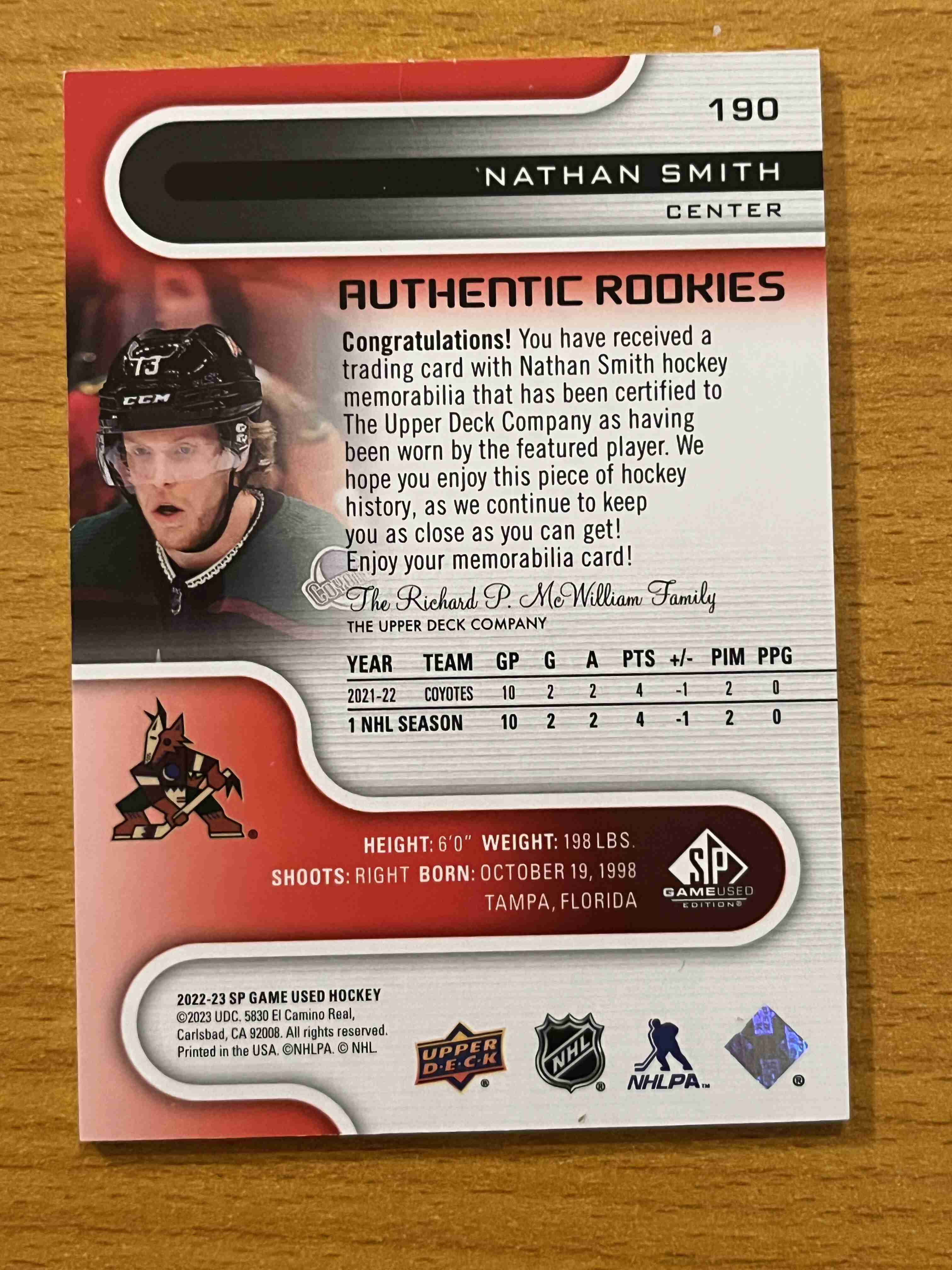 Nathan Smith 2022-23 SP Game Used Authentic Rookies Jersey