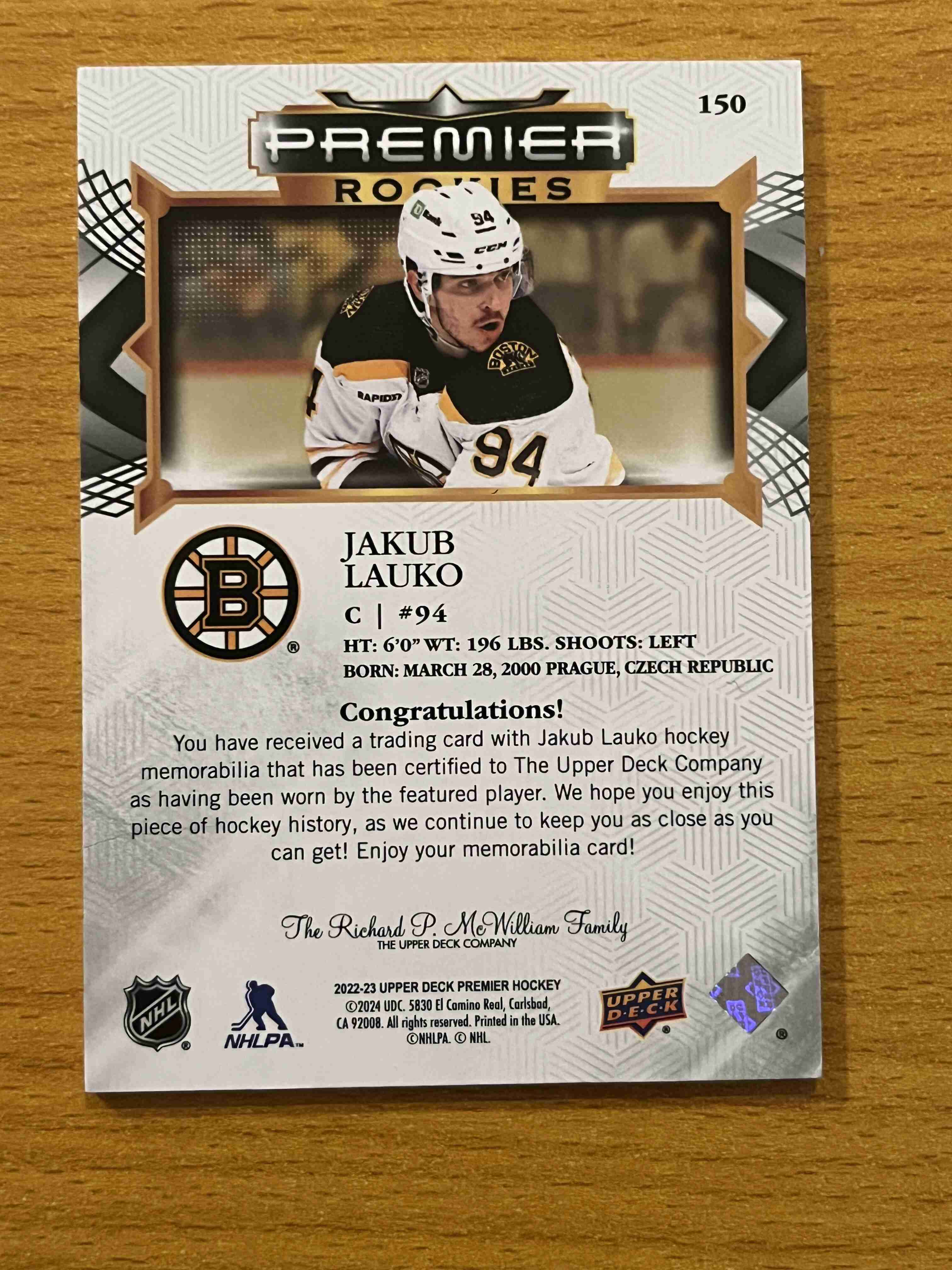 Jakub Lauko 2022-23 UD Premier Rookies Jersey