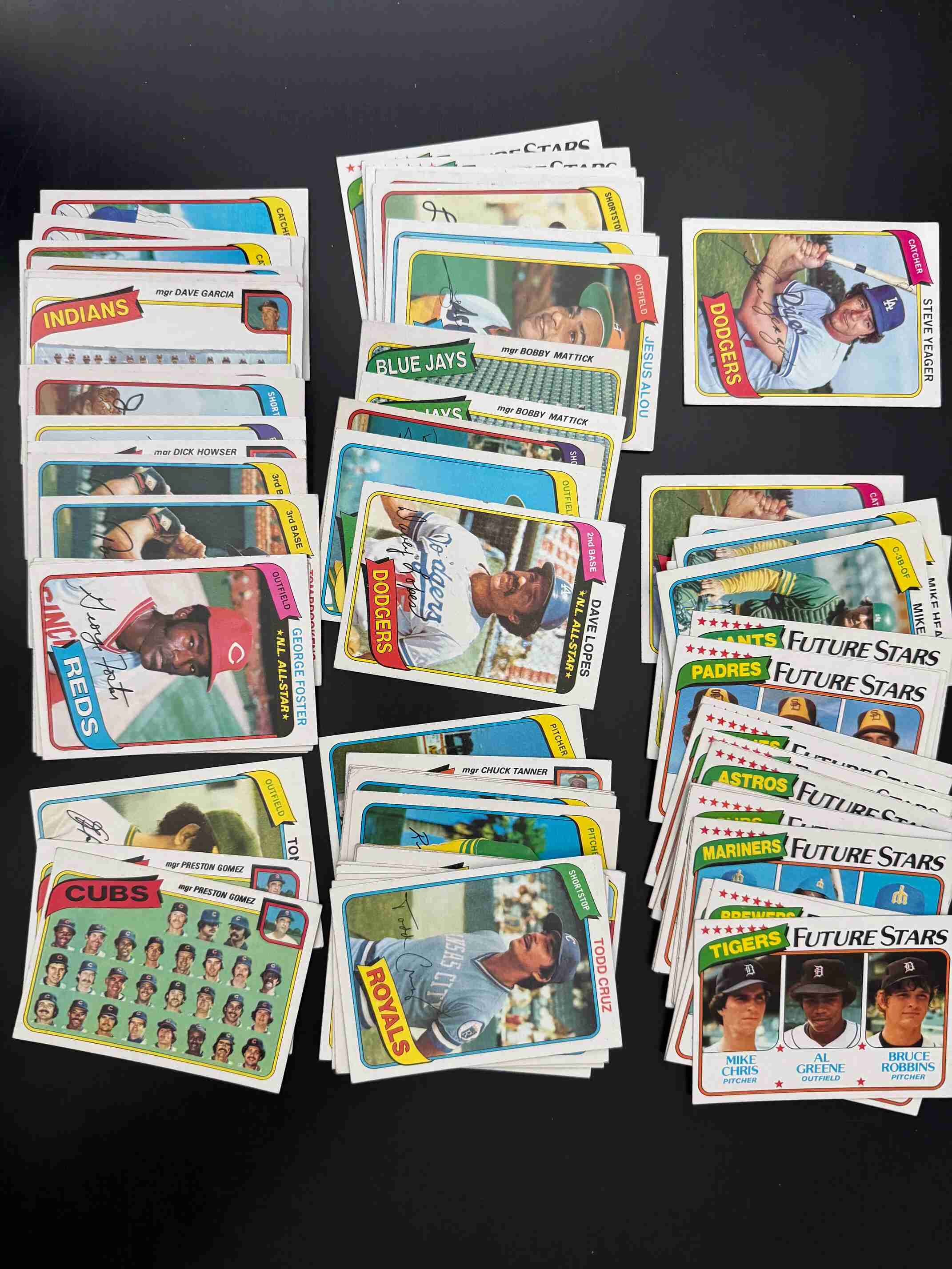 This is a large lot of approximately 200 cards from the 1980 Topps set. Estimated average condition is VG/Ex. See photos for some general condition examples.