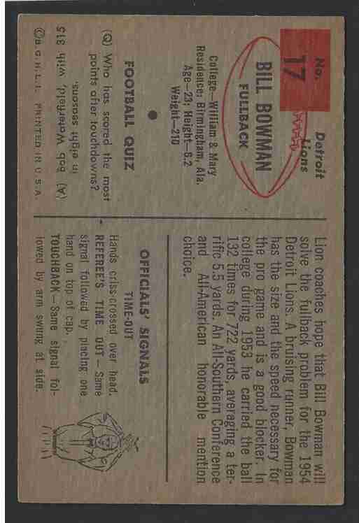 1954 Bowman Bill Bowman (RC) -#17- Lions