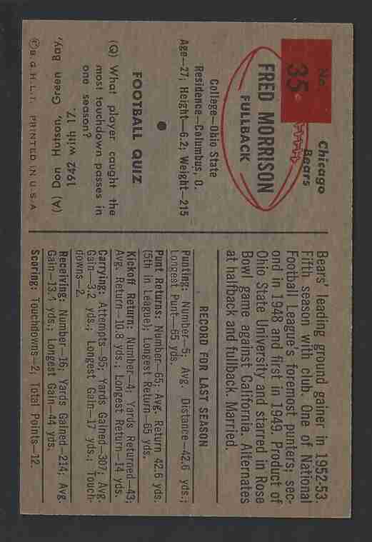 1954 Bowman Fred Morrison -#35- Bears. This is a higher-grade card. Card has minor flaws - nice corners. Nice shape for this era. Ships no tracking. Please review scans carefully for condition.
