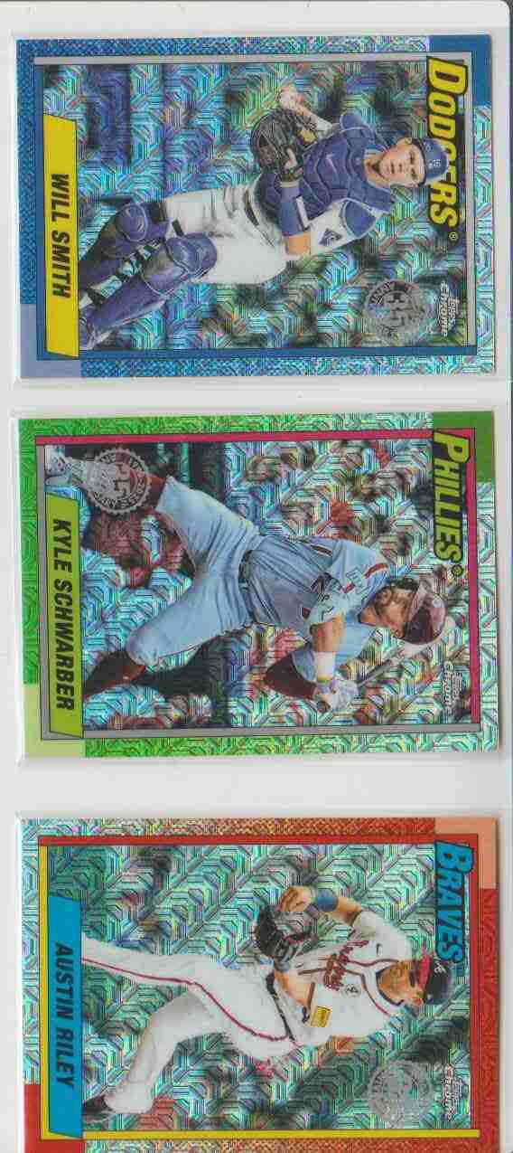 Please look at the photo for details on the condition of the cards. The cards you are bidding on are the cards pictured. This auction is for 3 2025 Topps Update 1990 35th Anniversary Chrome Mojos. They are Kyle Schwarber, Will Smith, and Austin Riley. If you have any questions or require more detailed images, please don't hesitate to ask. Note: The shipping price shown is for PWE. The cards will ship with a tracking number if the final auction price exceeds a certain dollar amount (or combined with the appropriate number of other completed auctions). Otherwise, the cards will be shipped PWE. Thank you!