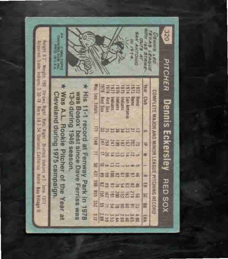 1980 Topps # 320 DENNIS ECKERSLEY Red Sox