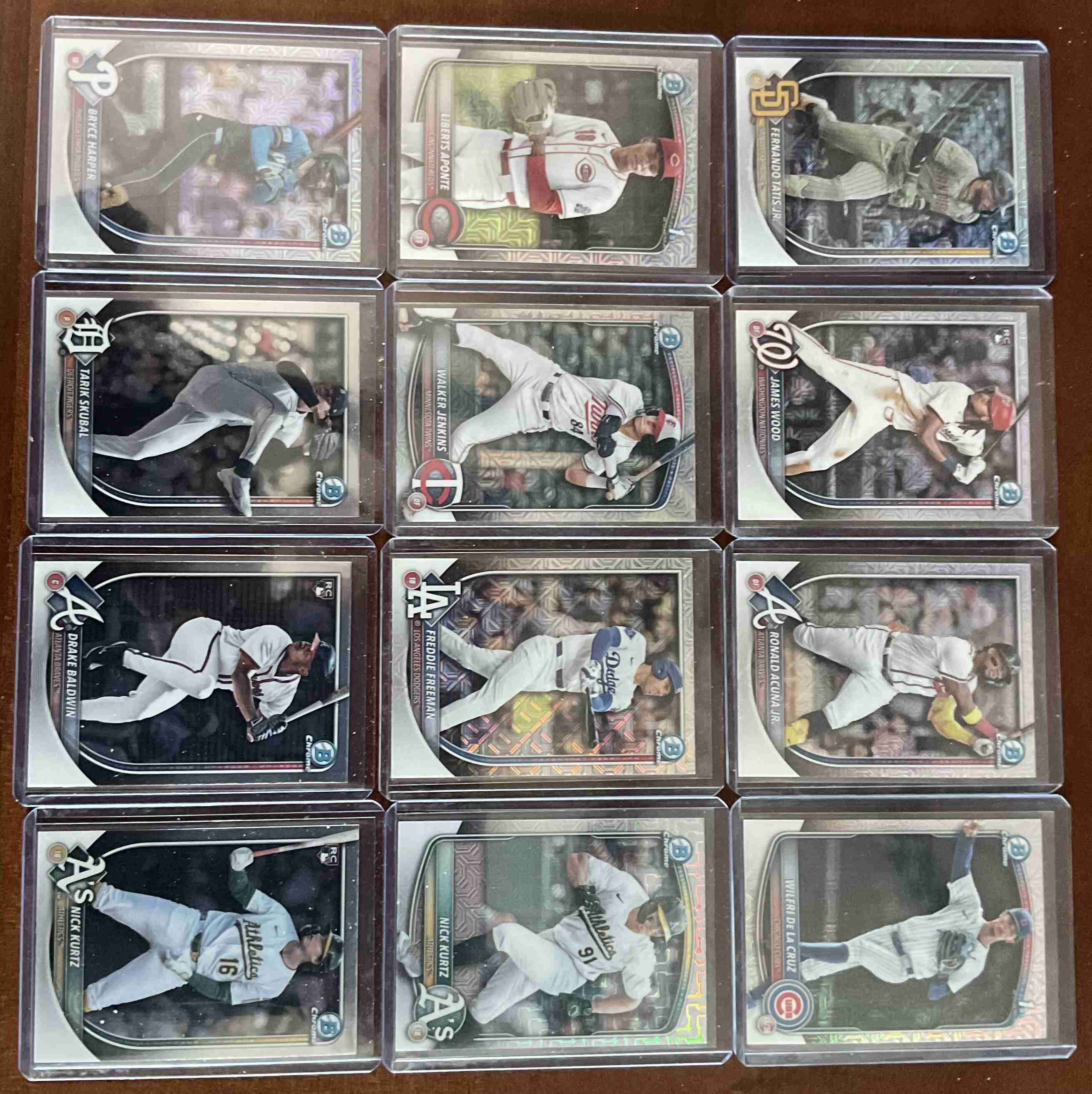 2025 Bowman Chrome 12 card lot - 3-Chrome and 9 Mojo Refractors… including Kurtz,Baldwin,Skubal,Freeman,Jenkins,Tatis jr….see pictures Thanks for looking..