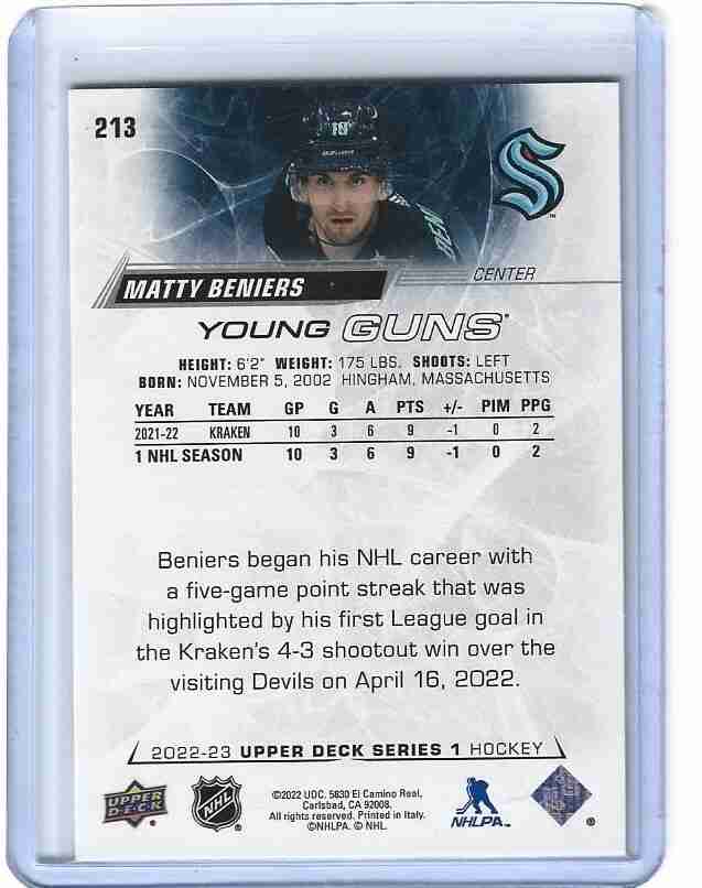2022/23 UD 1 #213 MATTY BENIERS YOUNG GUNS