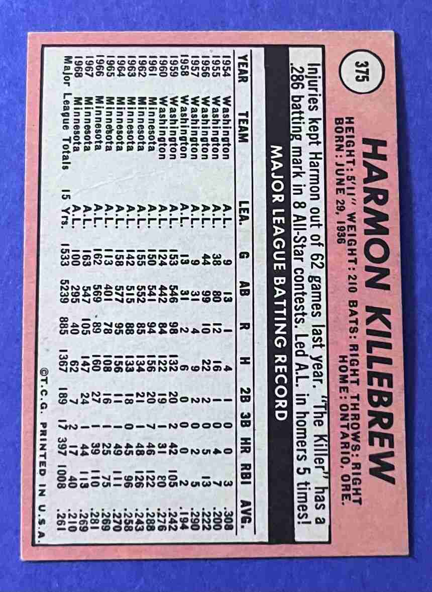 69 Topps HARMON KILLEBREW #375 HOF!