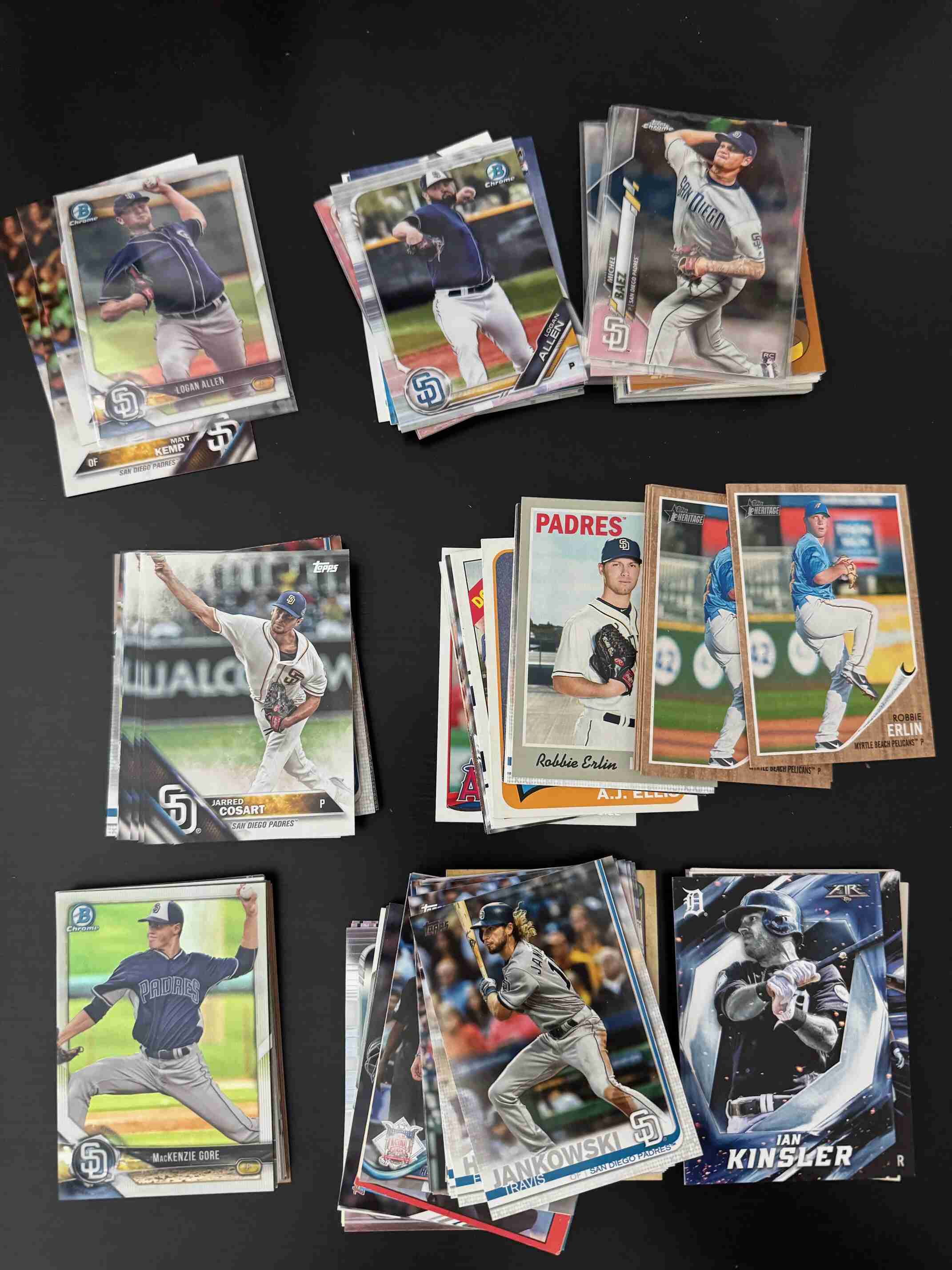 This is a large lot of 550 +/- baseball cards featuring players associated with the Padres franchise. Great lot for team collectors or card dealers/resellers. Most cards will be players who are depicted in the named team's uniforms/logo on the card, but some cards are players who were associated with the team at some recent point in time but are shown as associated with other teams.