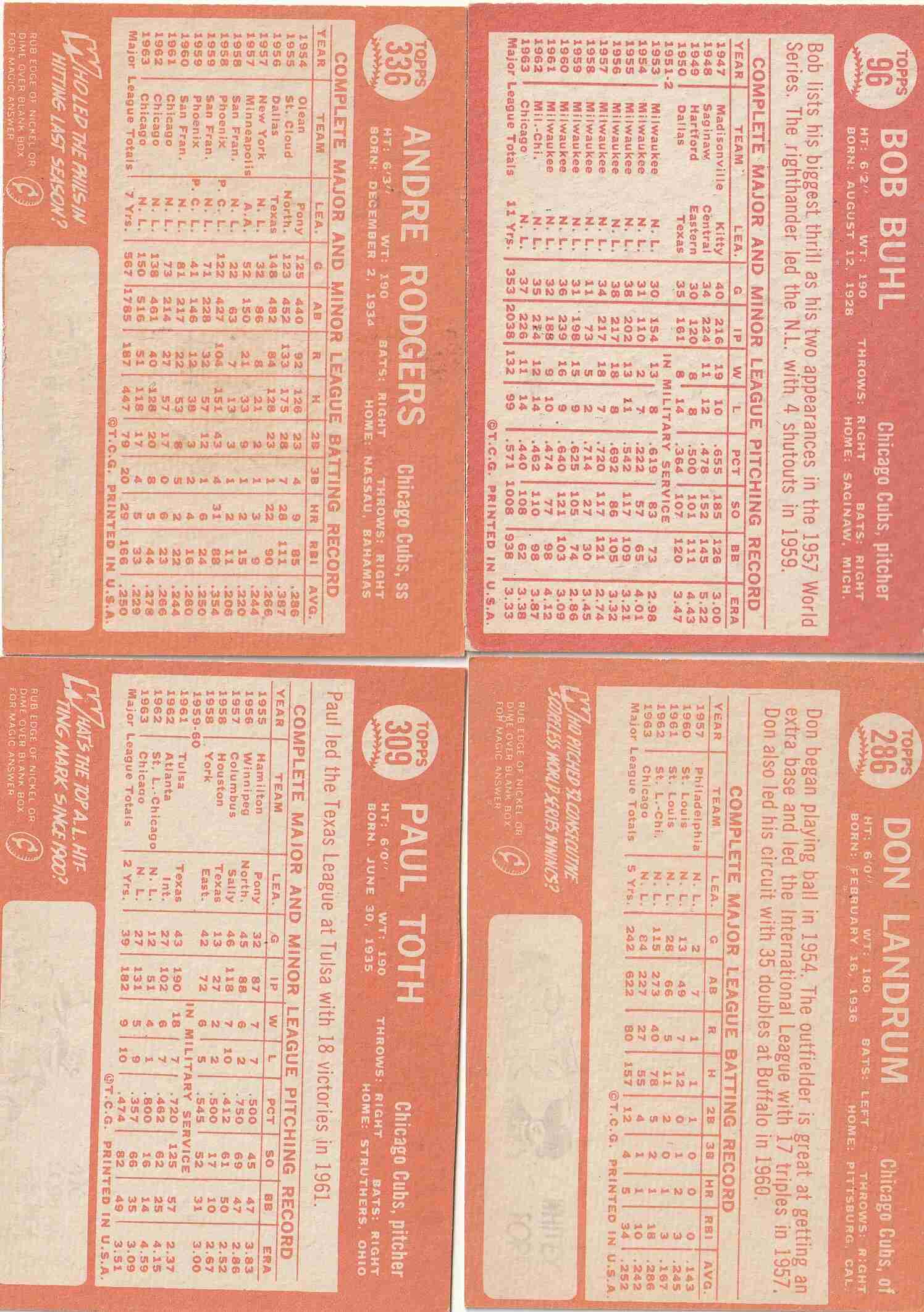 #96 Bob Buhl (EX+) in card right border stain #286 Don Landrum (NM/M) #309 Paul Toth (EX/NM) #336 Andre Rodgers (EX/EX+) )OC