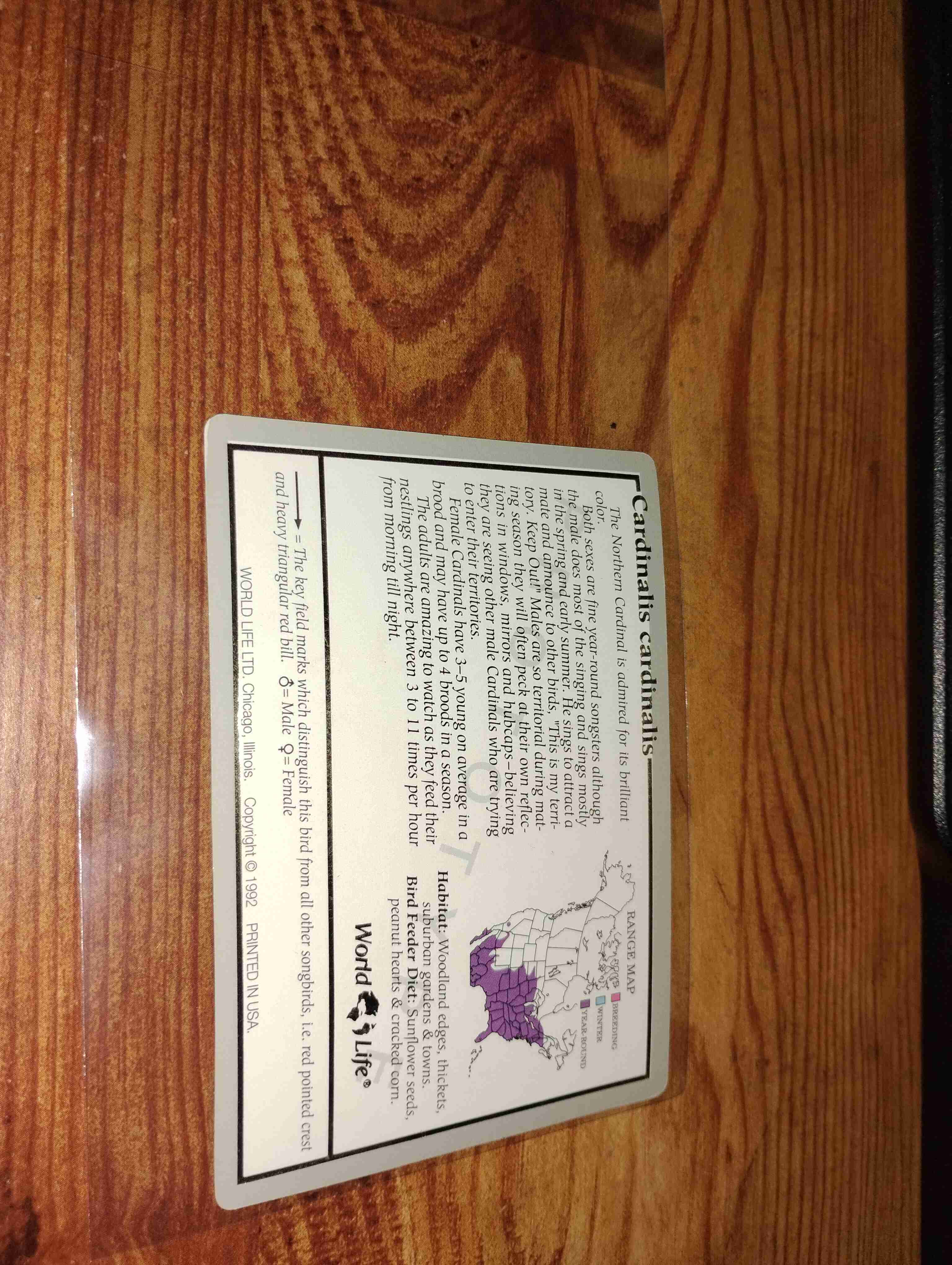 CARD IS PICTURED IN A PLASTIC SLEEVE.CARINAL IS PICTURED ON THE FRONT AND A BRIEF BIO AND SOME INFO OF THE BIRD IS ON THE BACK.1 OTHER BIRD CARD WILL BE INCLUDED WITH WINNING BID.