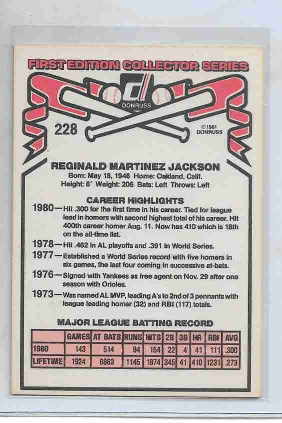 1981 Donruss #228 ~ Reggie Jackson New York Yankees HOF
