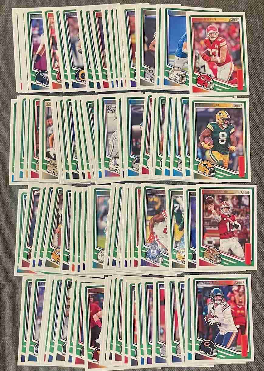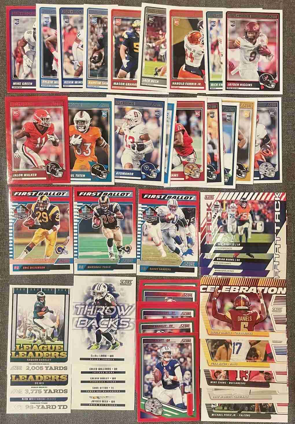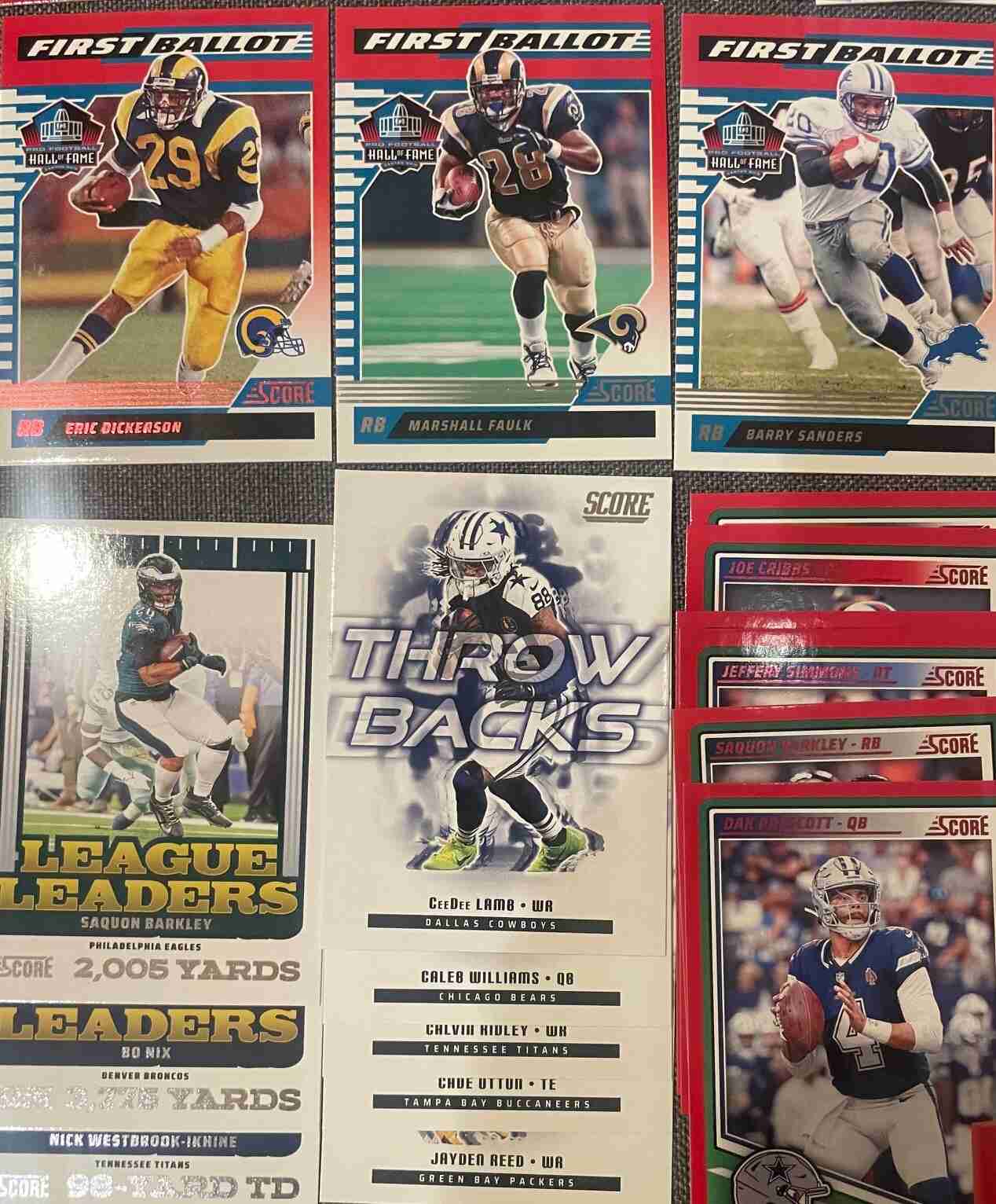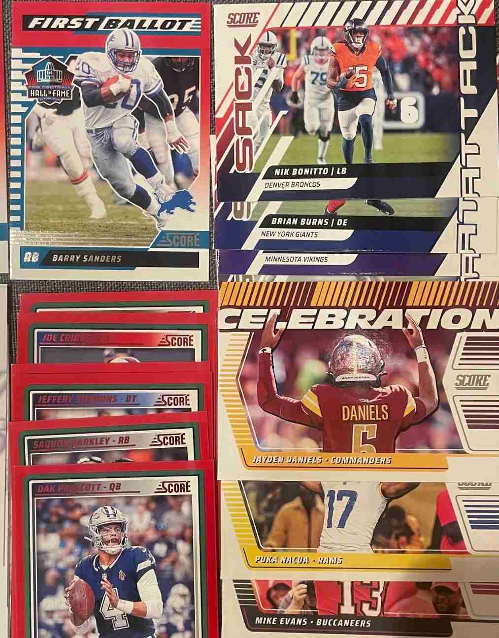 2025 Score Football Lot (142). 18 rookies with 2 red parallels. 26 Inserts/Parallels including, Dak, Saquon, Barry Sanders, Cee Dee, Jayden Daniels, Puka, Nix and more. The rest are base cards and I don't believe there are any duplicates, but I didn't look that closely. Please check out my other items.