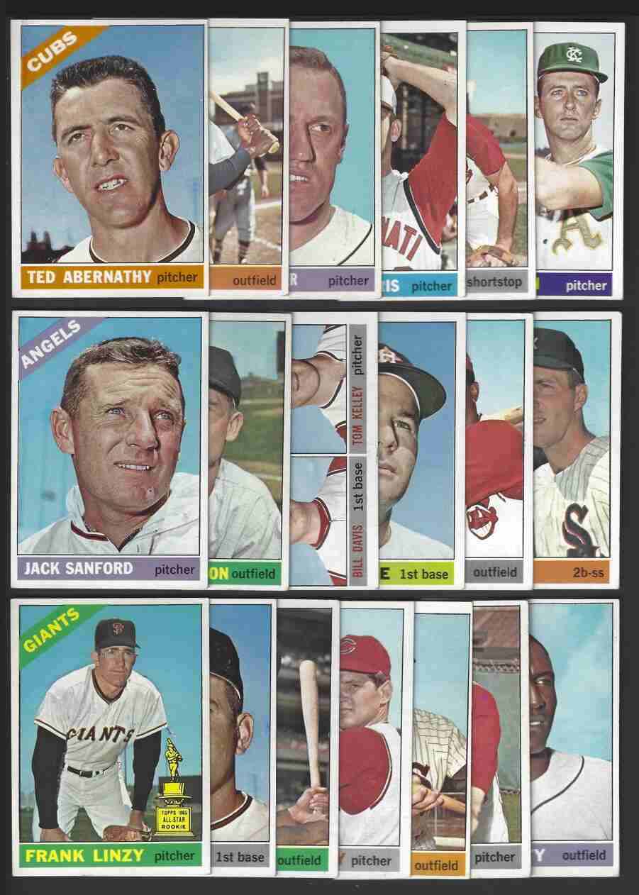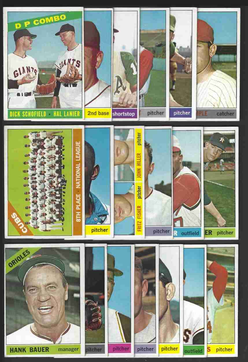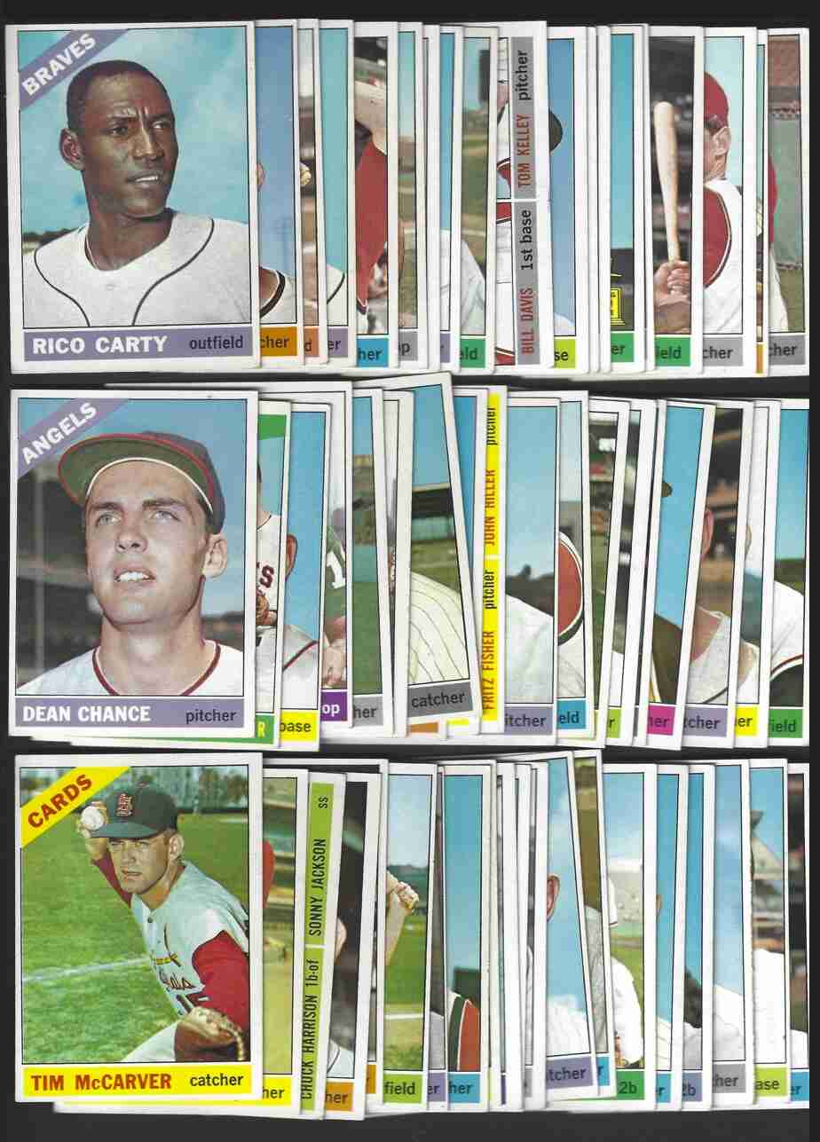 1966 Topps Baseball Lot (58) -Higher Grade-. No's-2,8,10,12,16,18,23,39,44, 45,65,66,78,88,94,109,127,129,153,156,161,175,197,201,202,204,206,209,213, 214,228,229,231,235,237,239,242,243,244,245,246,247,249,250,253,256,258,266, 268,269,271,272,275,280,339,340,352,357. Excellent large lot of 1966 Topps Baseball cards. This is a higher-grade lot. Cards have minor flaws; most have nice corners. Nice lot! Please review scans carefully for condition.