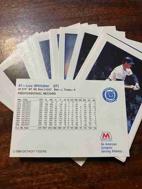 1989 DETROIT TIGERS TEAM SET (28) MARATHON GASOLINE (LOCAL). ALL CARDS ARE IN ERX=NM CONDITION.