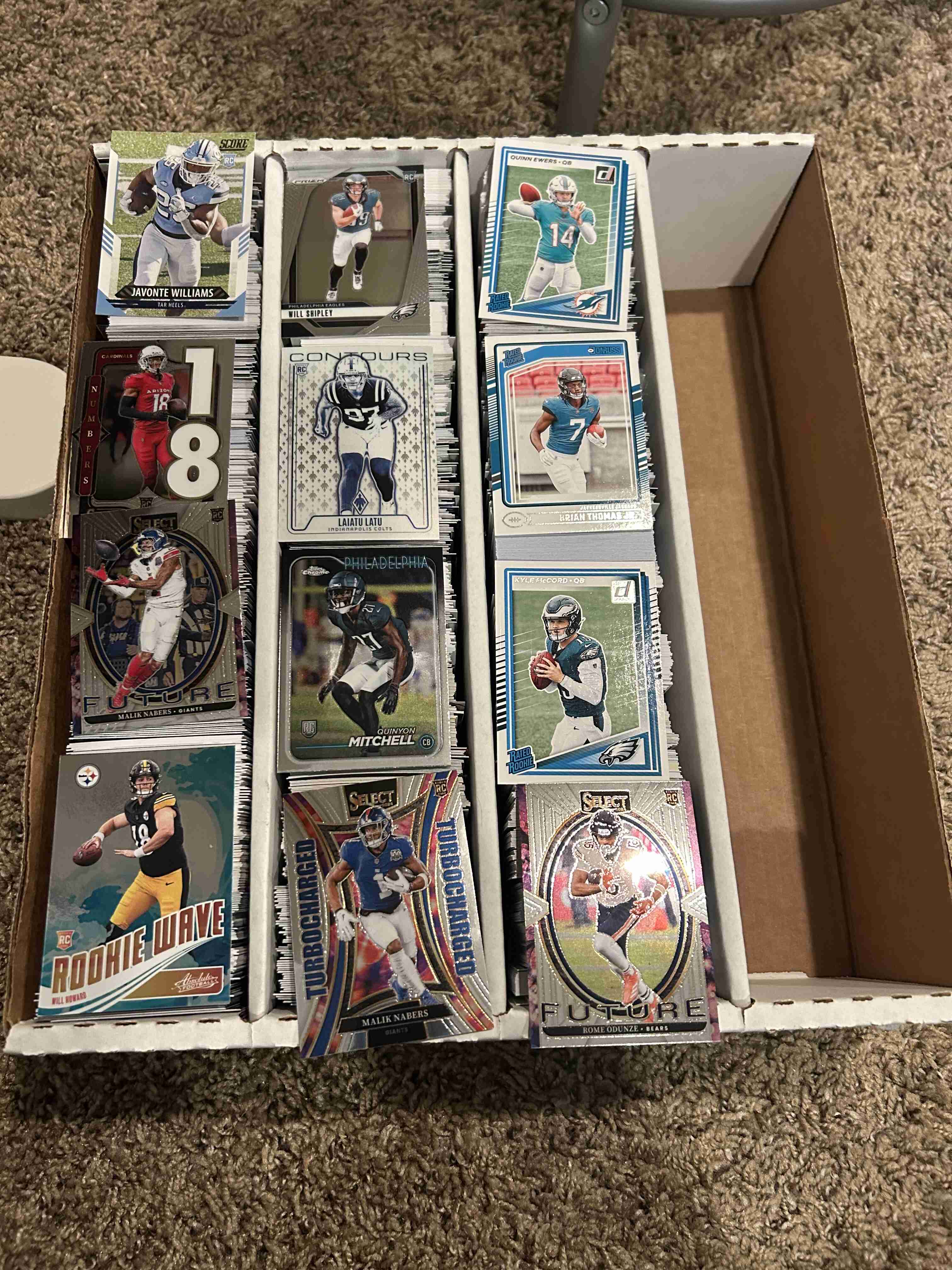 2,000+ NFL/football rookie cards from 2021-2025. Good mix of years, players, brands, inserts, etc. Features Topps and Panini cards across all brands like Prizm, Chrome, Donruss, Optic, Select, etc.