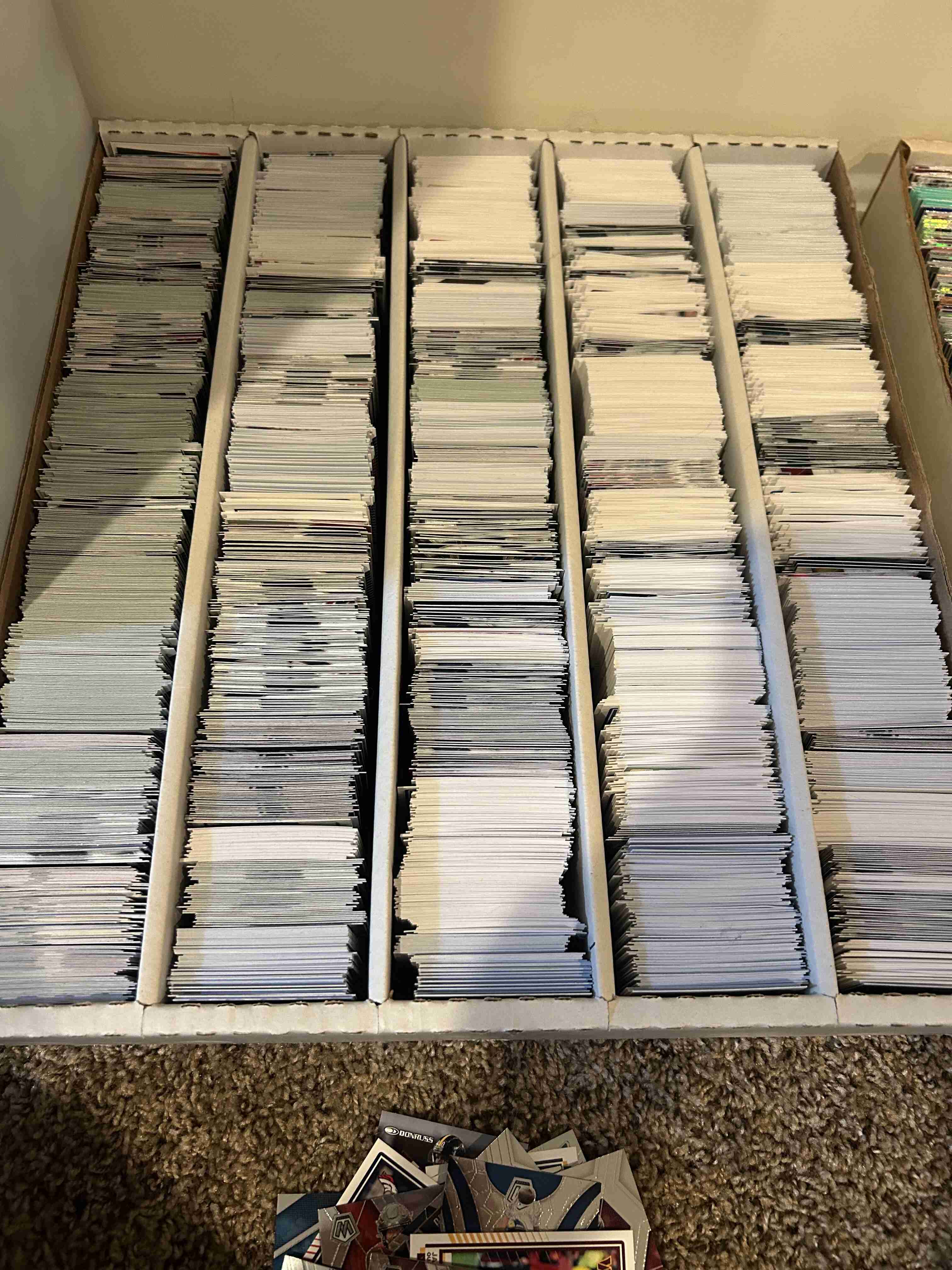 4,000+ NFL/football modern cards from 2021-2025 of the game's biggest current stars, including Patrick Mahomes, Josh Allen, Justin Jefferson, Matthew Stafford, etc. Good mix of years, players, brands, inserts, etc. Features Topps and Panini cards across all brands like Prizm, Chrome, Donruss, Optic, Select, etc.
