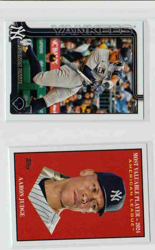 Please look at the photo for details on the condition of the cards. The cards you are bidding on are the cards pictured. This auction is for 2 2025 Topps Update Aaron Judge cards. They are MVP Insert #MV-1 and Legends Unite #US-86. If you have any questions or require more detailed images, please don't hesitate to ask. Note: The shipping price shown is for PWE. The cards will ship with a tracking number if the final auction price exceeds a certain dollar amount (or combined with the appropriate number of other completed auctions). Otherwise, the cards will be shipped PWE. Thank you!