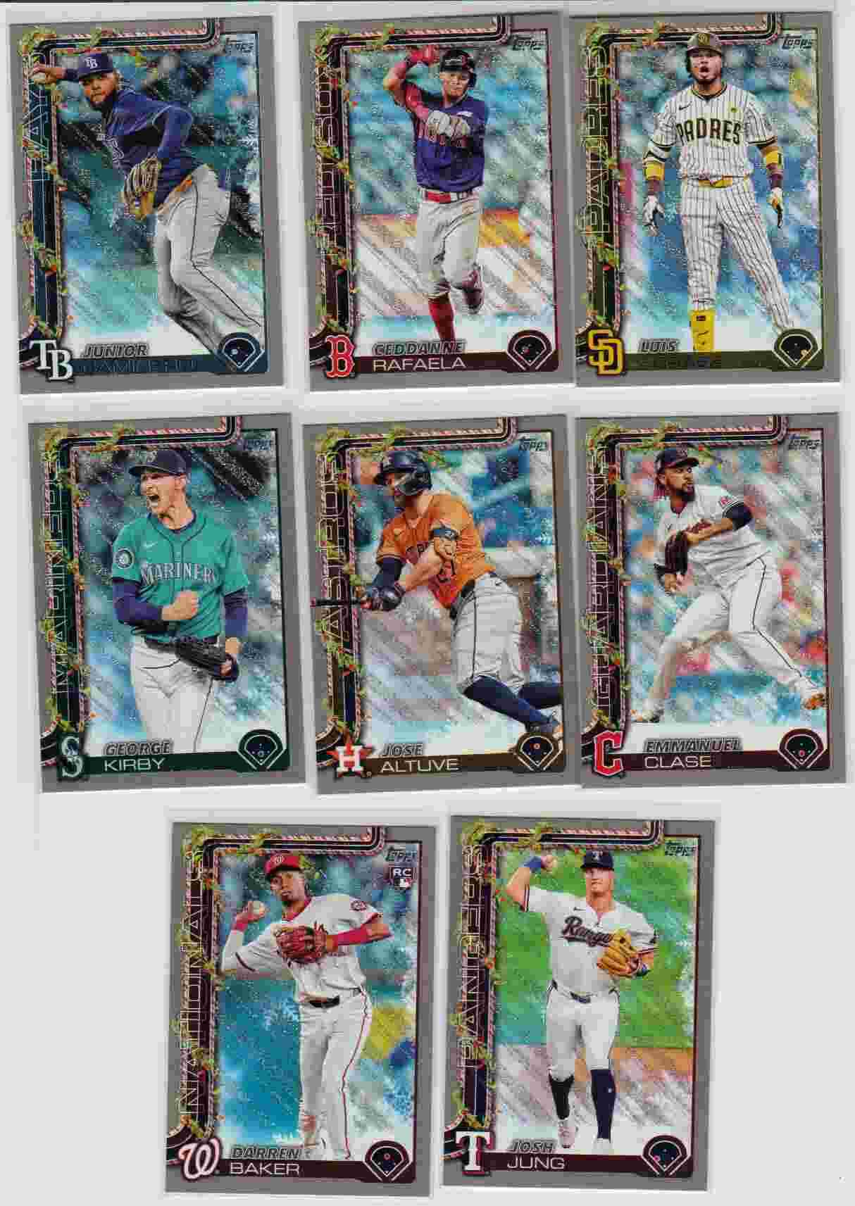 Please review the photo for details on the condition of the cards. The cards you are bidding on are the cards pictured. This auction is for 8 2025 Topps Holiday Grey (Silver) Glitter Parallels. Please take a look at the photo for the complete listing. If you have any questions or require more detailed images, please don't hesitate to ask.