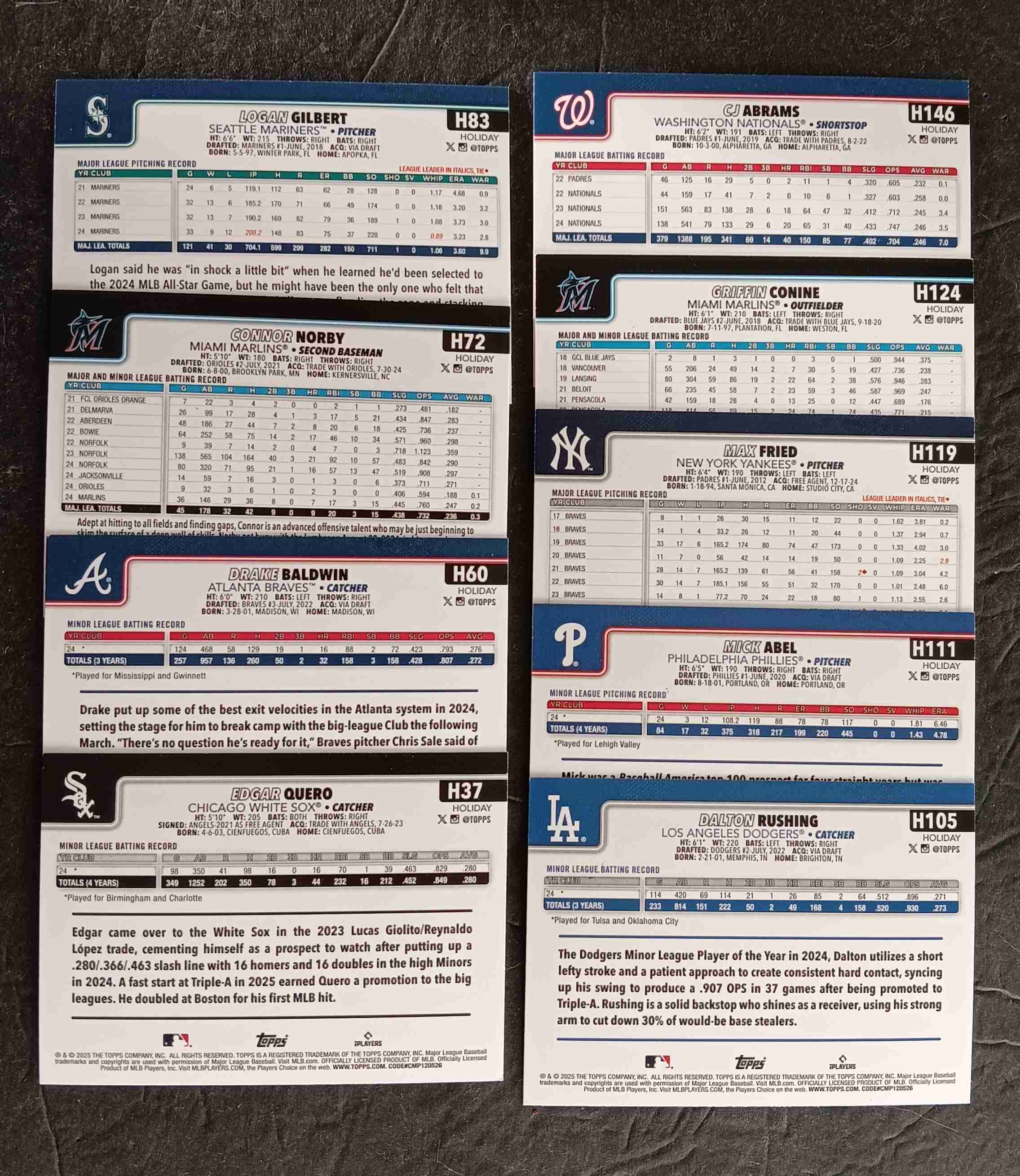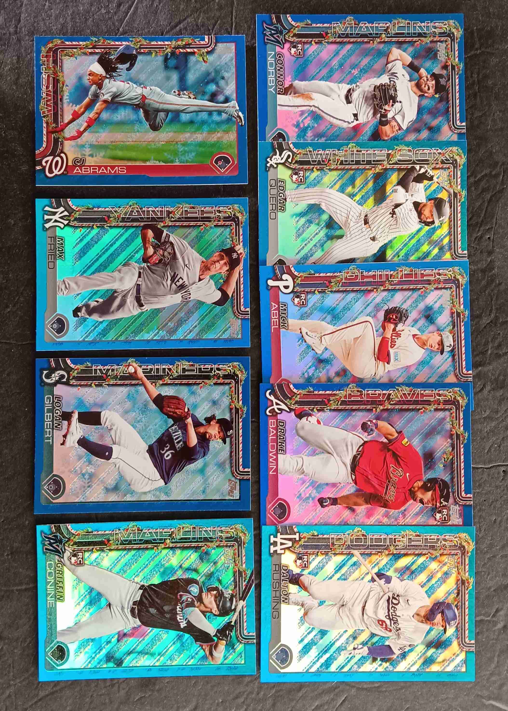 This auction is for some 2025 Topps Holiday Blue Metalic Glitter Parallel Baseball cards.There are 9 cards and they are in NM condition. Thanks for looking.