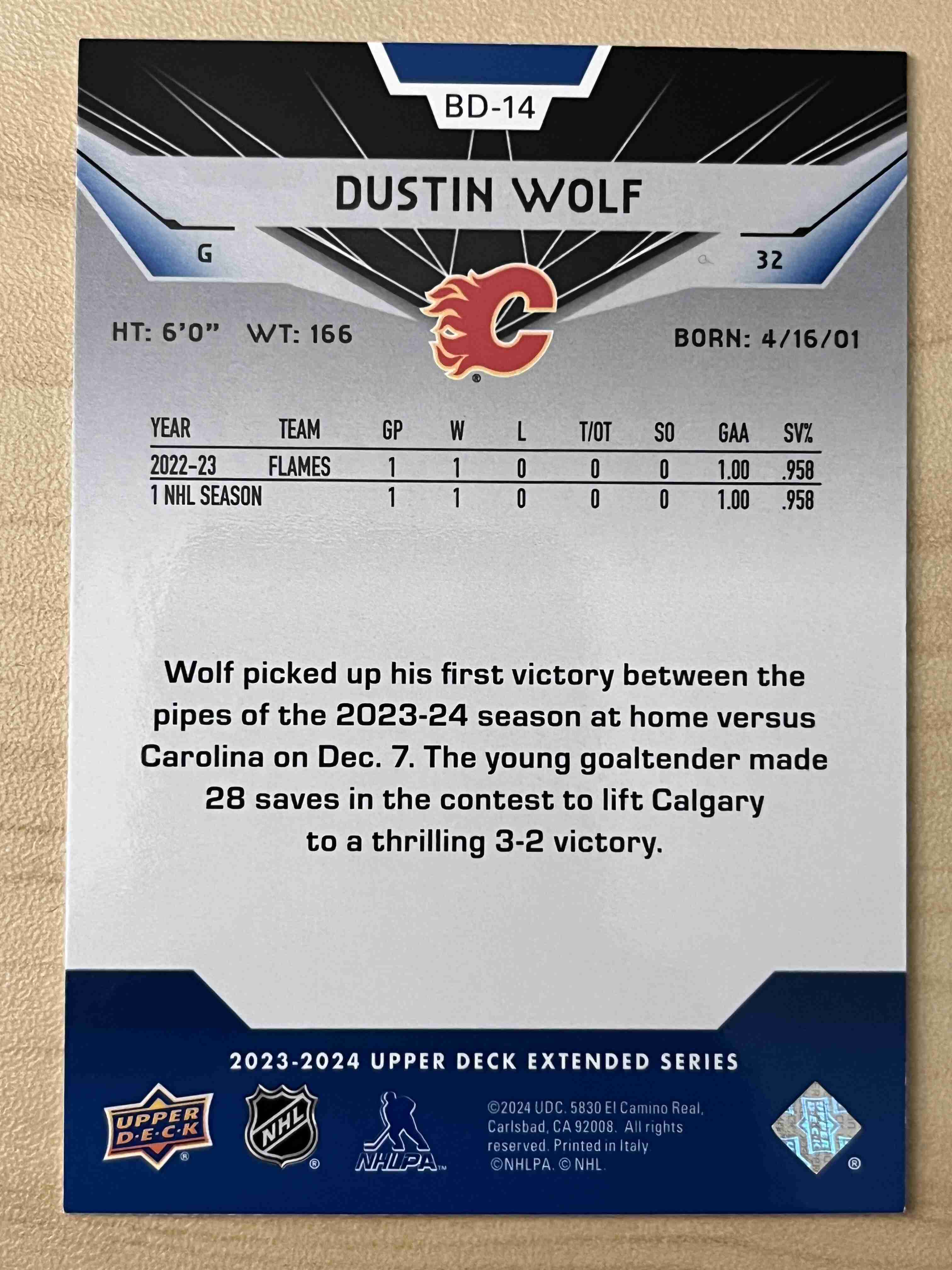 Dustin Wolf 2023-24 UD Extended RC Black Diamond #BD-14