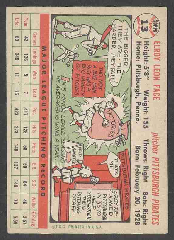 1956 TOPPS ROY FACE (WHITE BACK) #13 - NM