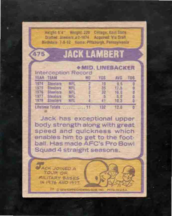 1979 Topps #475 HOFer JACK LAMBERT Pitt. Steelers
