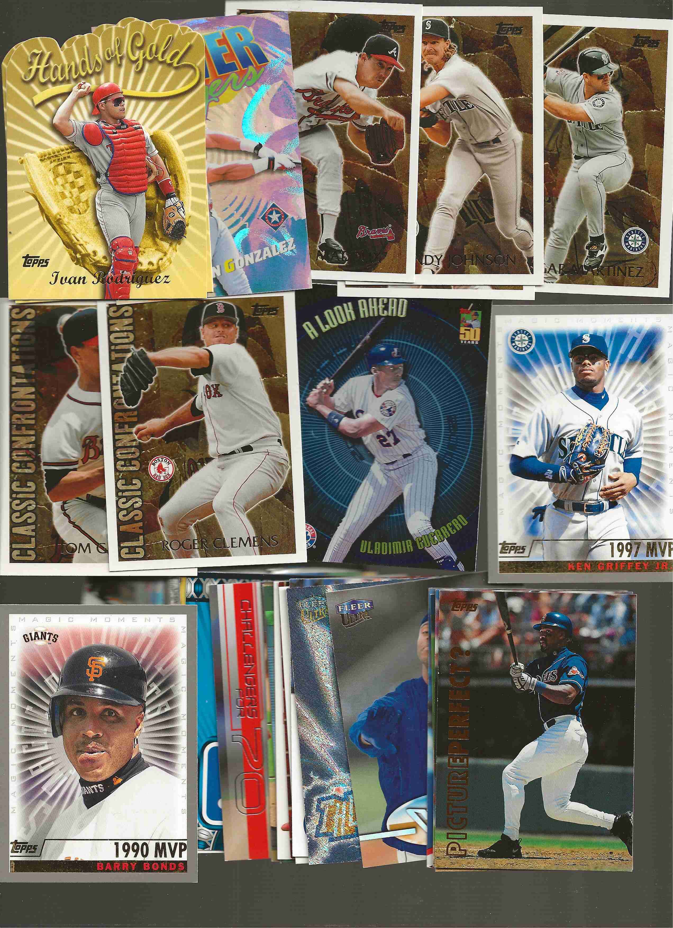 less than 10cents per card. Not enough cards of any one set to make its own listing. Cards include Topps, Leaf, Ultra, Upper Deck, Donruss and more. Stars include Griffey Jr, Bagwell, Canseco, Bonds, McGwire, Ripken, AROD Clemens and more