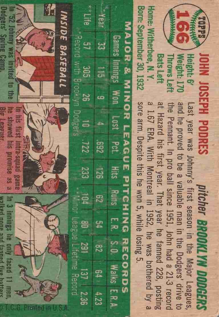 1954 Topps #166 Johnny Podres Brooklyn Dodgers