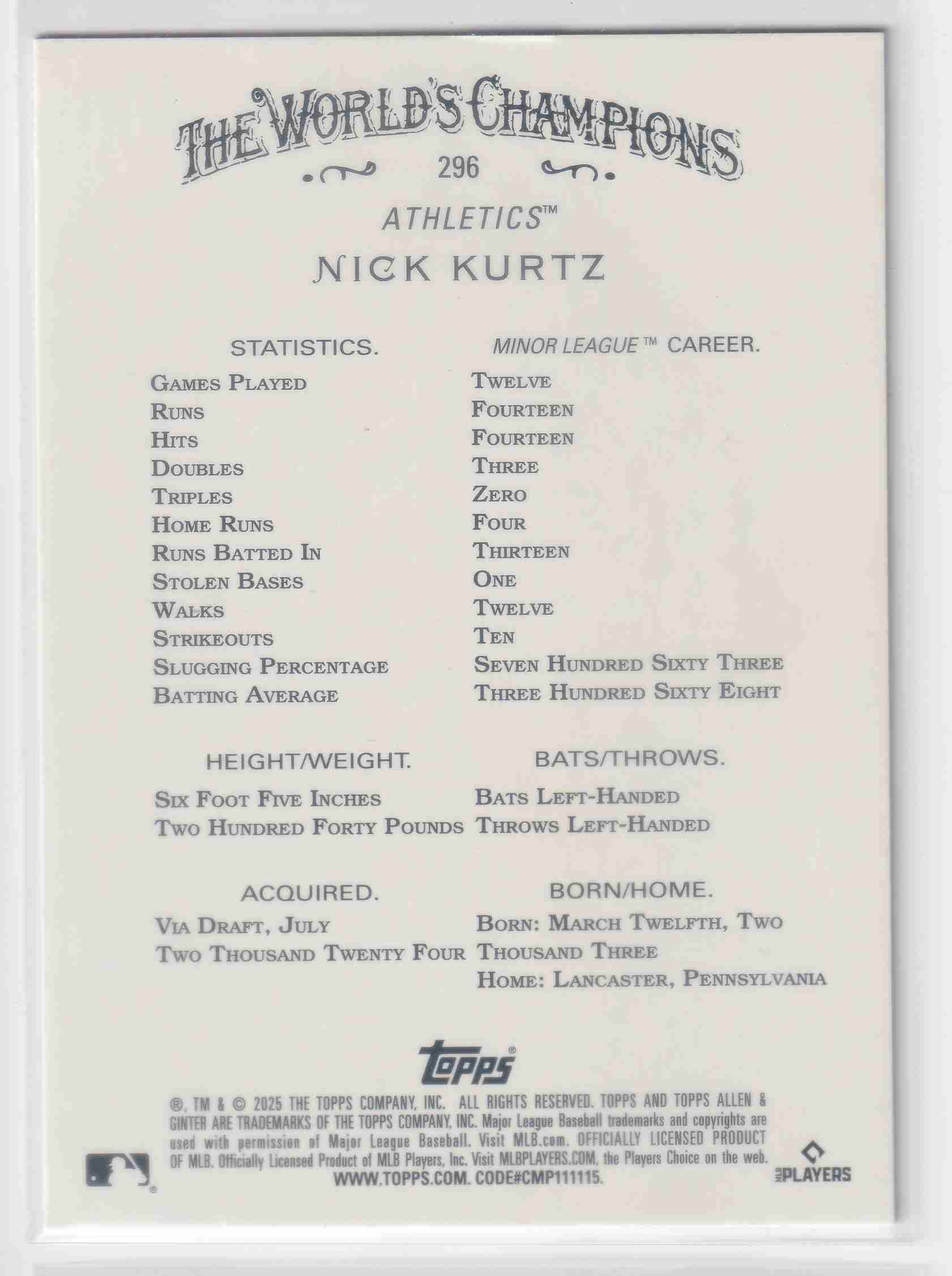 For auction is a Nick Kurtz 2025 Topps Allen & Ginter Rookie #296 RAINBOW PARALLEL. Overall the card presents nicely, but does have some minor back edge issue(s) so is being sold as EX-MT. Please refer to scans for more details. Card will Ship Securely via USPS. Please note: I will be out of town the week of December 22-30 (plus or minus a day) - for payments received during that time period, cards will ship upon my return (if the auction lasts that long).