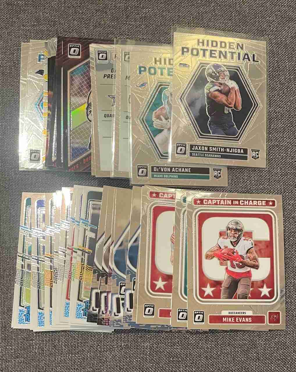 2023 Optic Football Lot (36) Includes rookie year inserts of Jaxon Smith-Ngijba and Devon Achane. Inserts of Mahomes, Saquon, Dak, Jahmyr Gibbs, Tua, Josh Allen, Burrow and more, plus some other rookies and rookie inserts. Nice lot. Hope to be adding some more auction items so click link above.