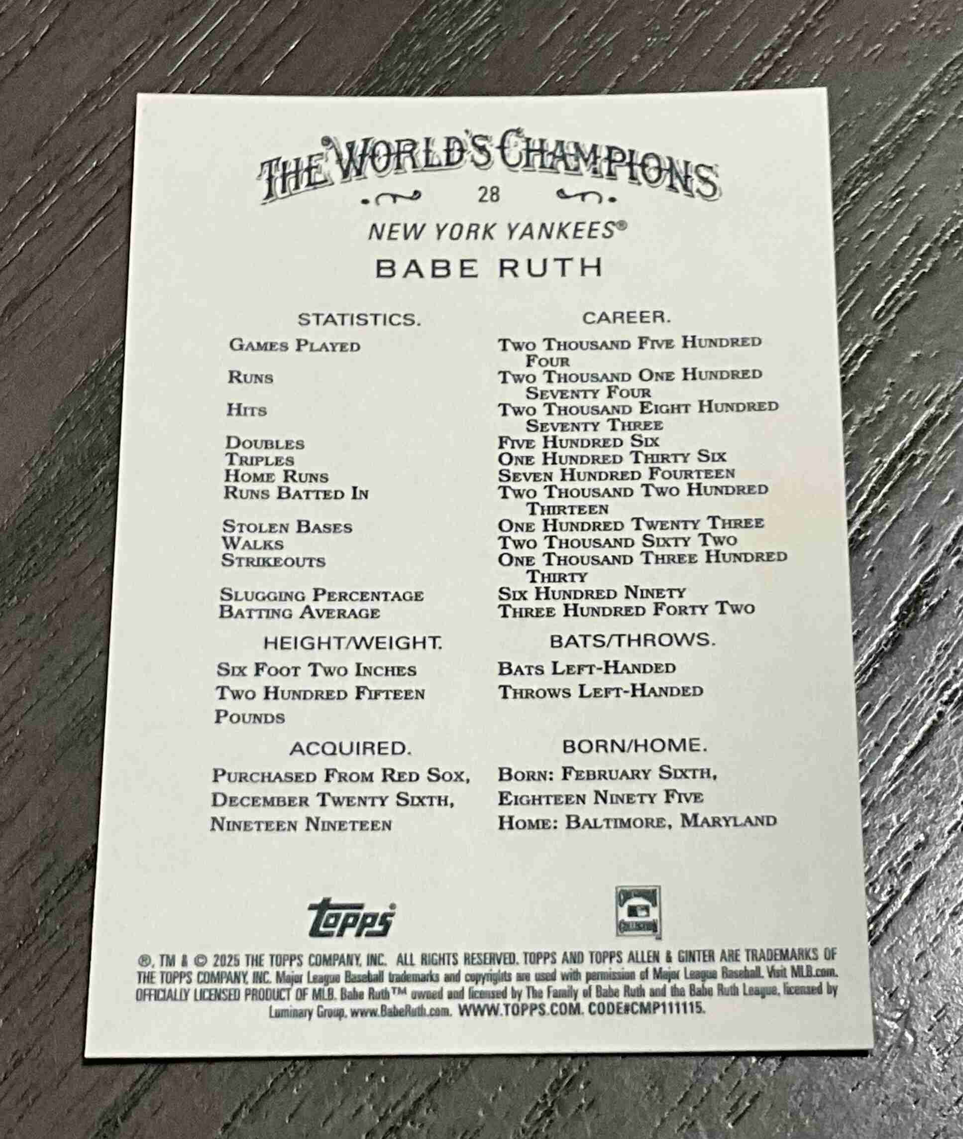 Babe Ruth 2025 Allen & Ginter # 28 NY Yankees