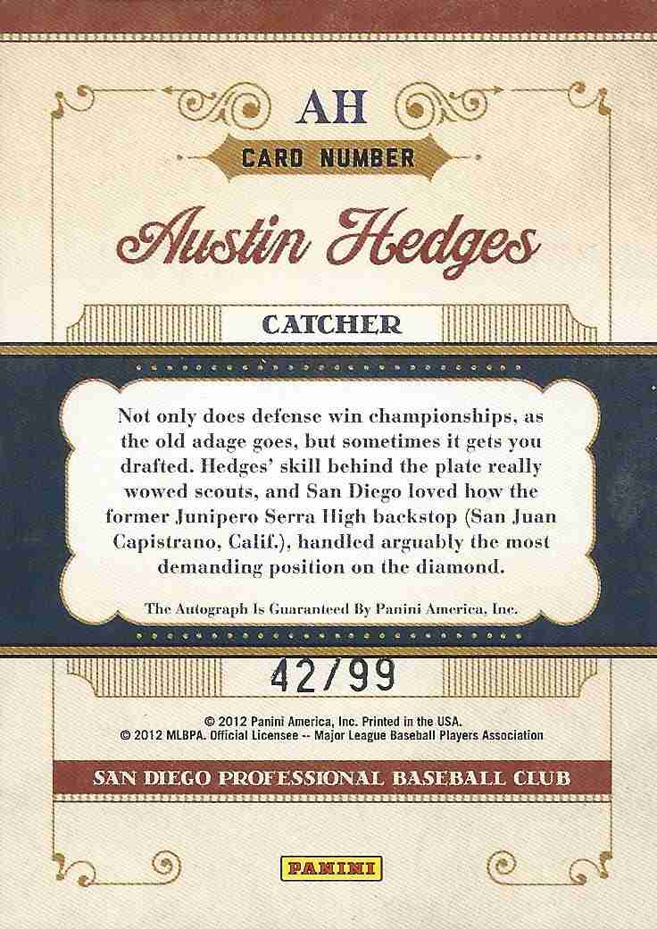 2011 Panini Prime Cuts Prospect Signatures Silver Autograph Rookie Card (#AH) of the San Diego Padres standout catcher Austin Hedges.