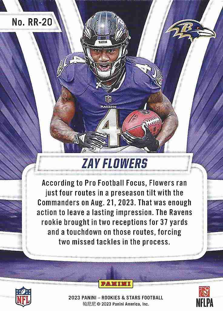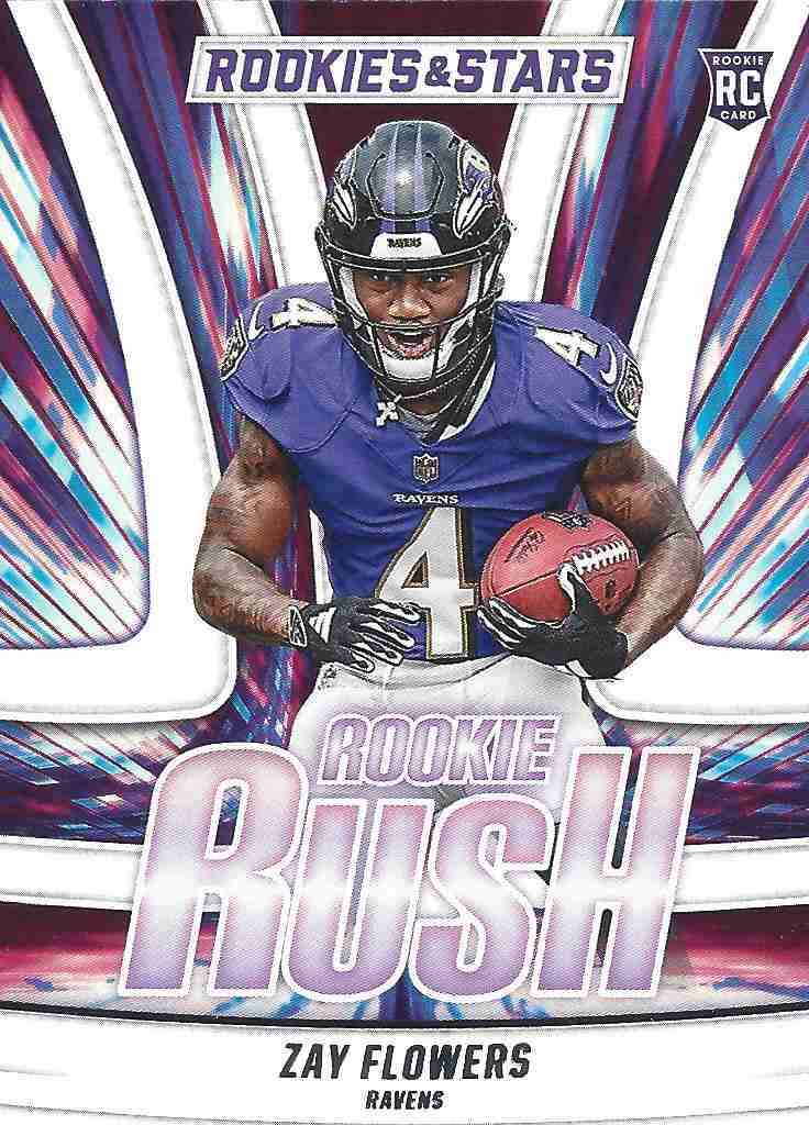 2023 Panini Rookies and Stars Rookie Rush Rookie Card (#RR-20) of the Baltimore Ravens standout wide receiver Zay Flowers. The card is in NM condition.