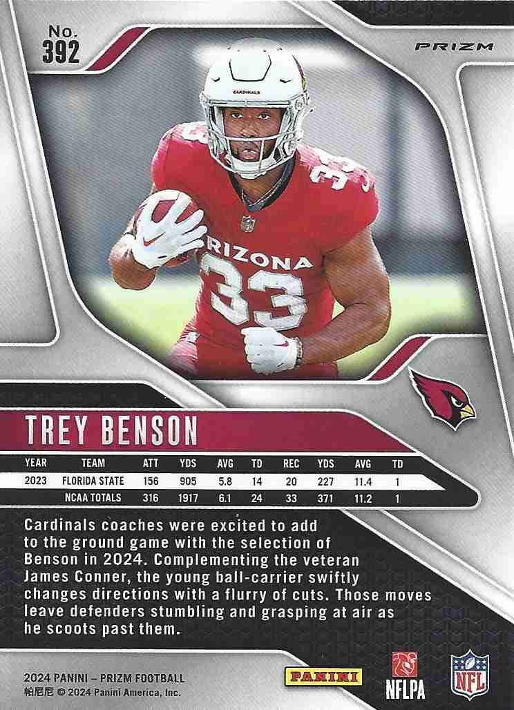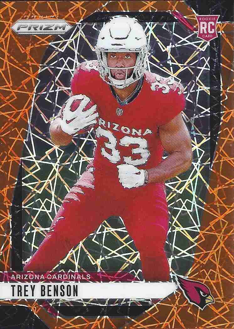 2024 Panini Prizm Prizms Orange Ice Rookie Card (#392) of the Arizona Cardinals standout tight end Trey Benson. The card is in NM condition.