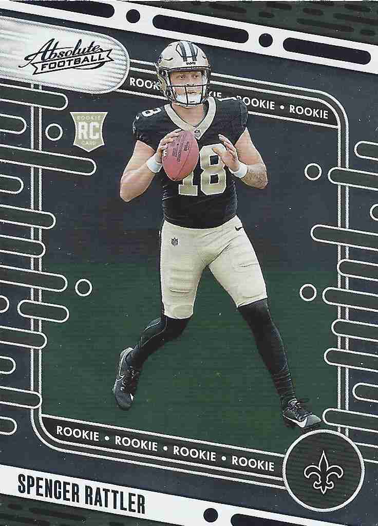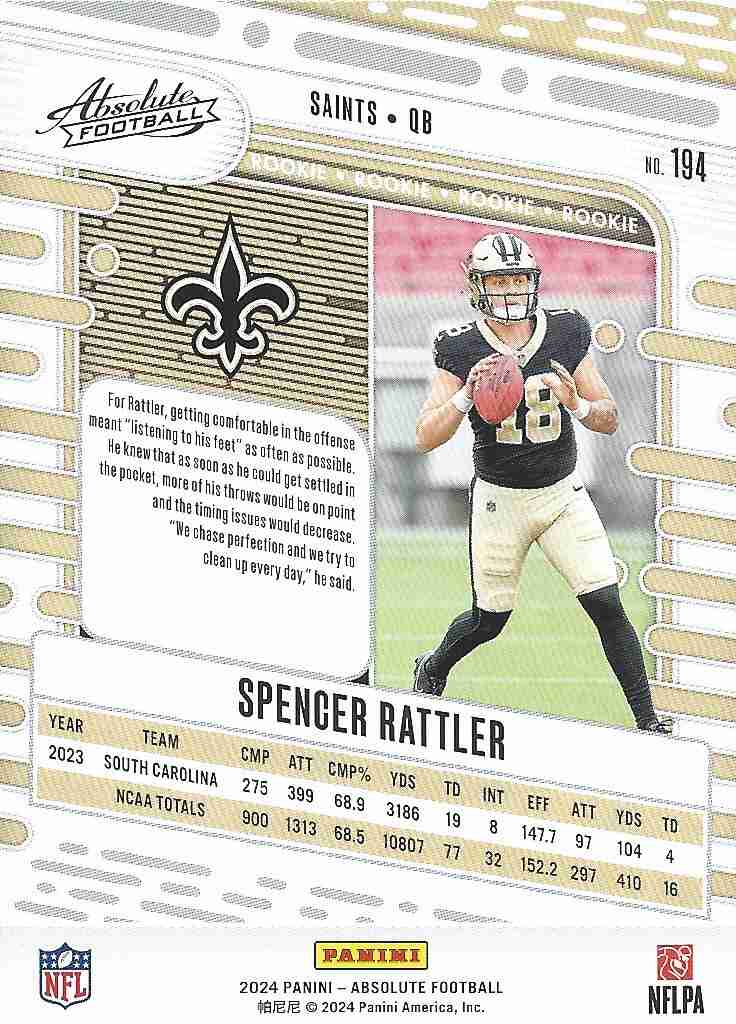2024 Panini Absolute Rookie Card (#194) of the New Orleans Saints standout quarterback Spencer Rattler. The card is in NM condition.