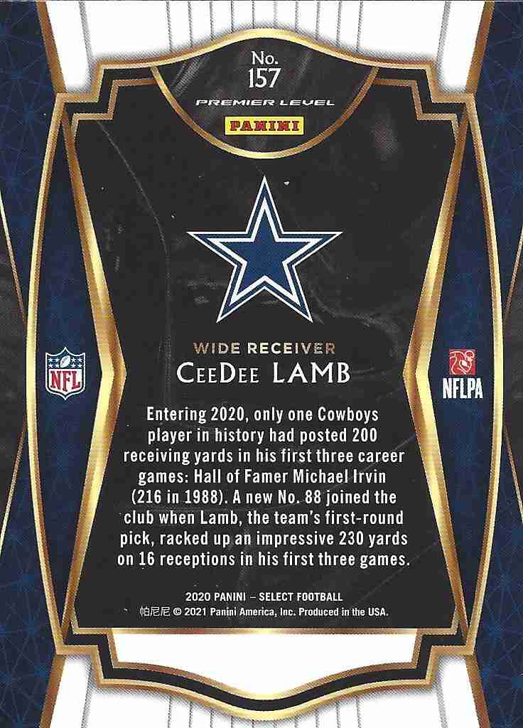 2020 Panini Select Rookie Card (#190) of the Dallas Cowboys standout wide receiver CeeDee Lamb. The card is in NM condition.
