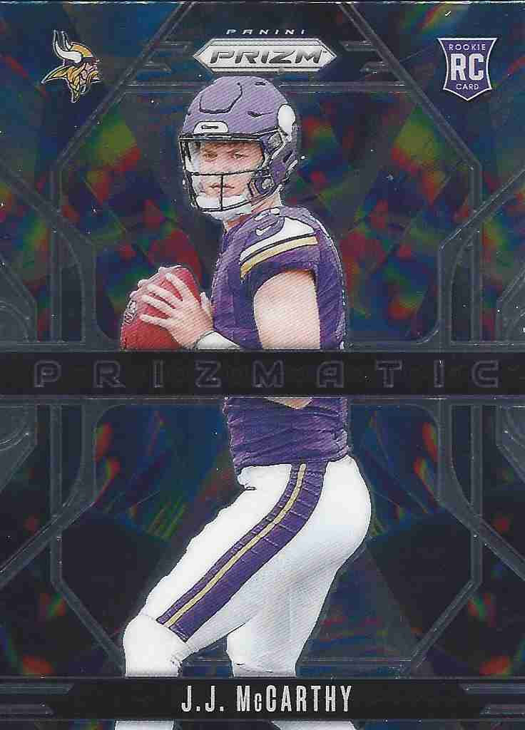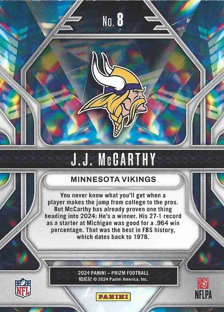 2024 Panini Prizm Prizmatic Insert Rookie Card (#8) of the Minnesota Vikings standout quarterback J.J. McCarthy The card is in NM condition.