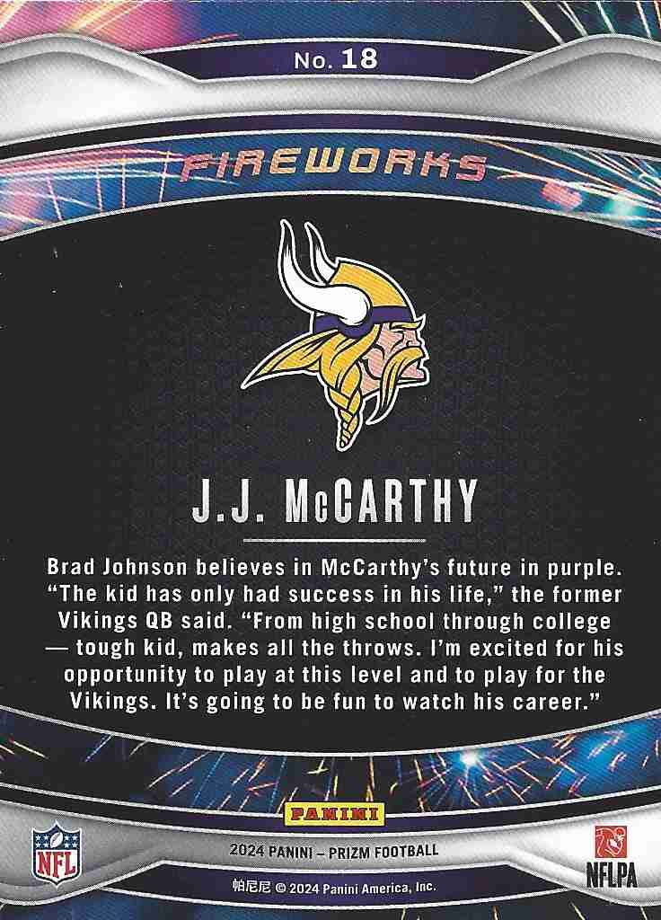 2024 Panini Prizm Fireworks Insert Rookie Card (#18) of the Minnesota Vikings standout quarterback J.J. McCarthy The card is in NM condition.