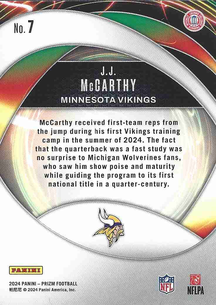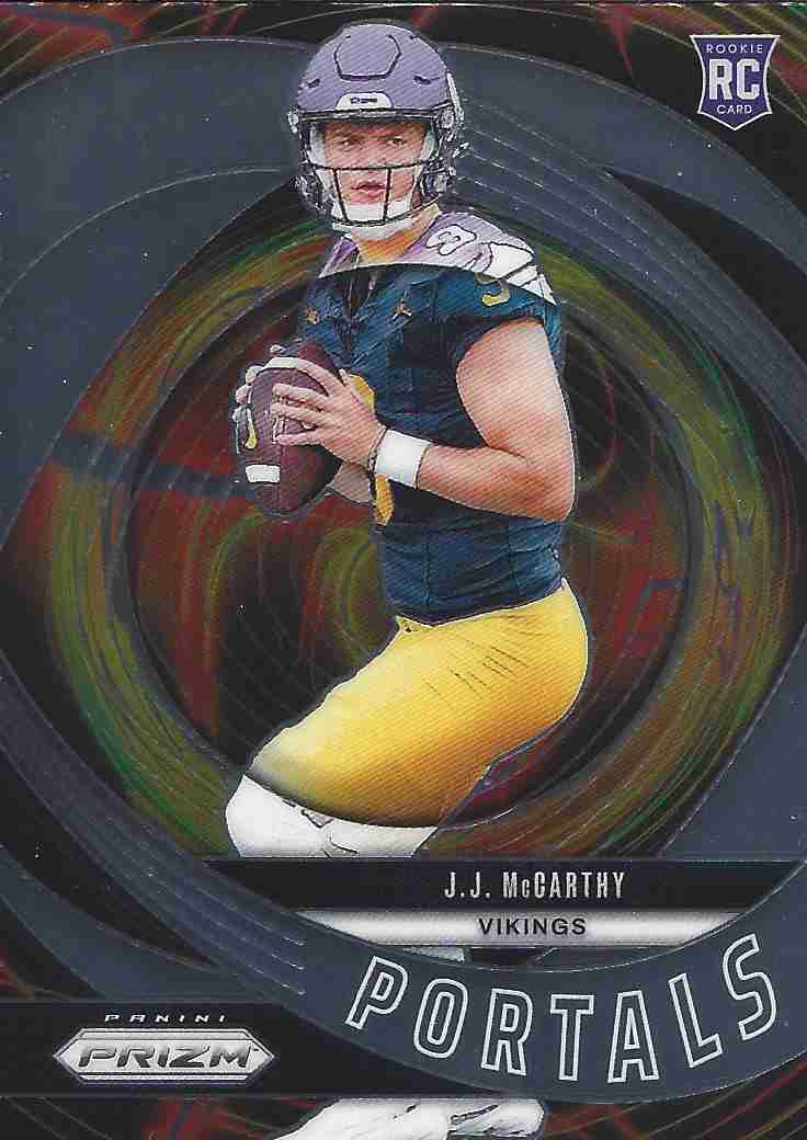 2024 Panini Prizm Portals Insert Rookie Card (#7) of the Minnesota Vikings standout quarterback J.J. McCarthy The card is in NM condition.