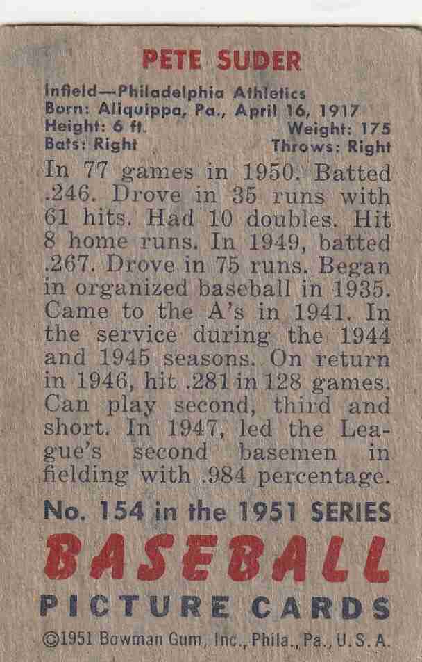 1951 Bowman #154 Pete Suder Philadelphia A's (lower grade)