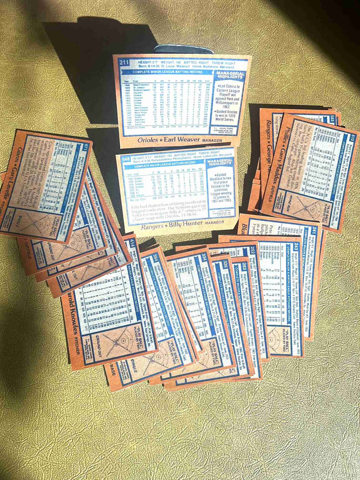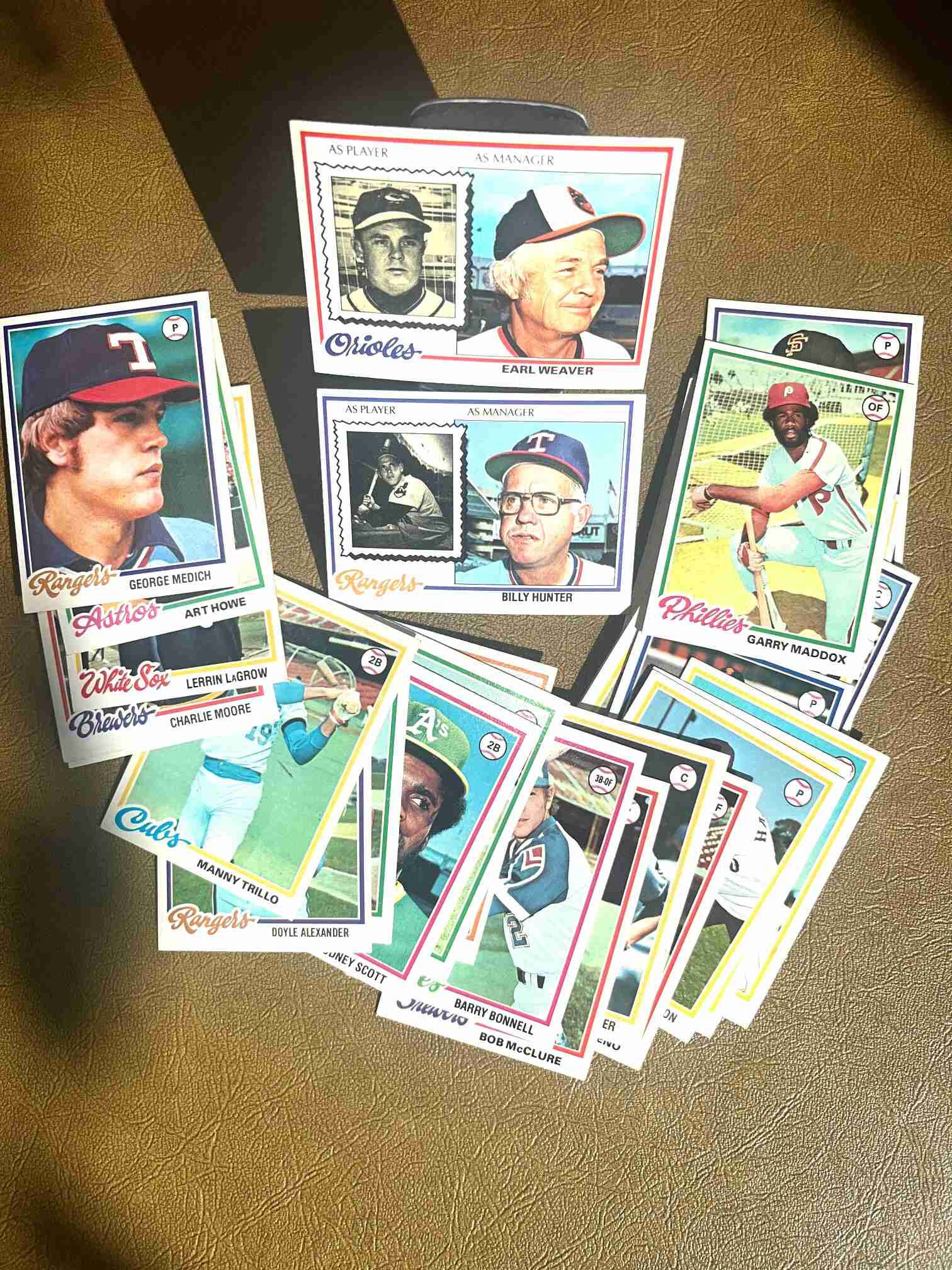 Lot of 31(thirty-one) 1978 Topps Baseball cards thought to be in mostly NM condition but see photos for condition as displayed. Maybe a few wrinkles but no duplicates and arranged in numerical order. Includes Earl Weaver HOF Orioles and Rangers Mgr/Coaches, Art Howe, Gary Maddox, Doc Medich etc. Please see other auctions for combined shipping.