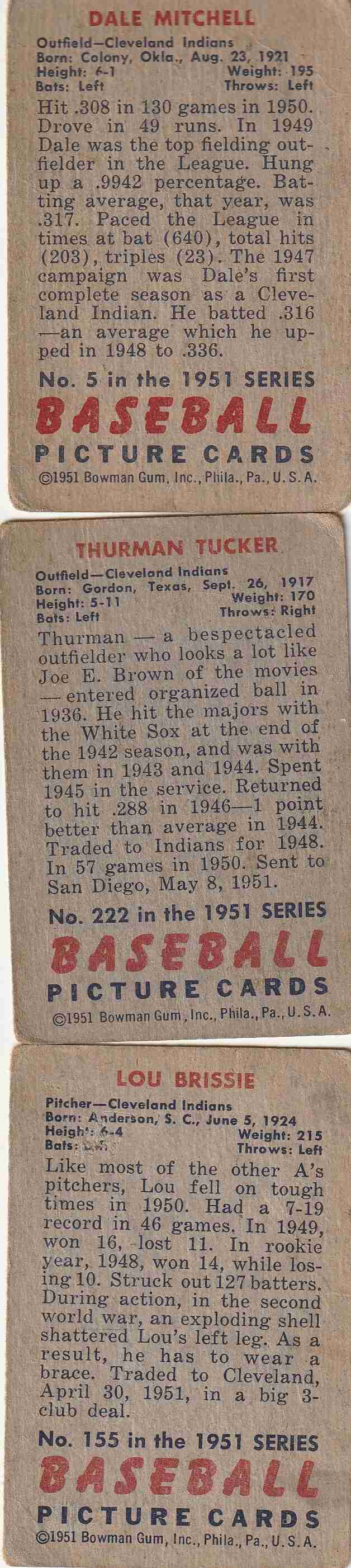 #5 Dale Mitchell (Good) #155 Lou Brissie (Good-VG) #222 Thurman Tucker (VG/VG+)