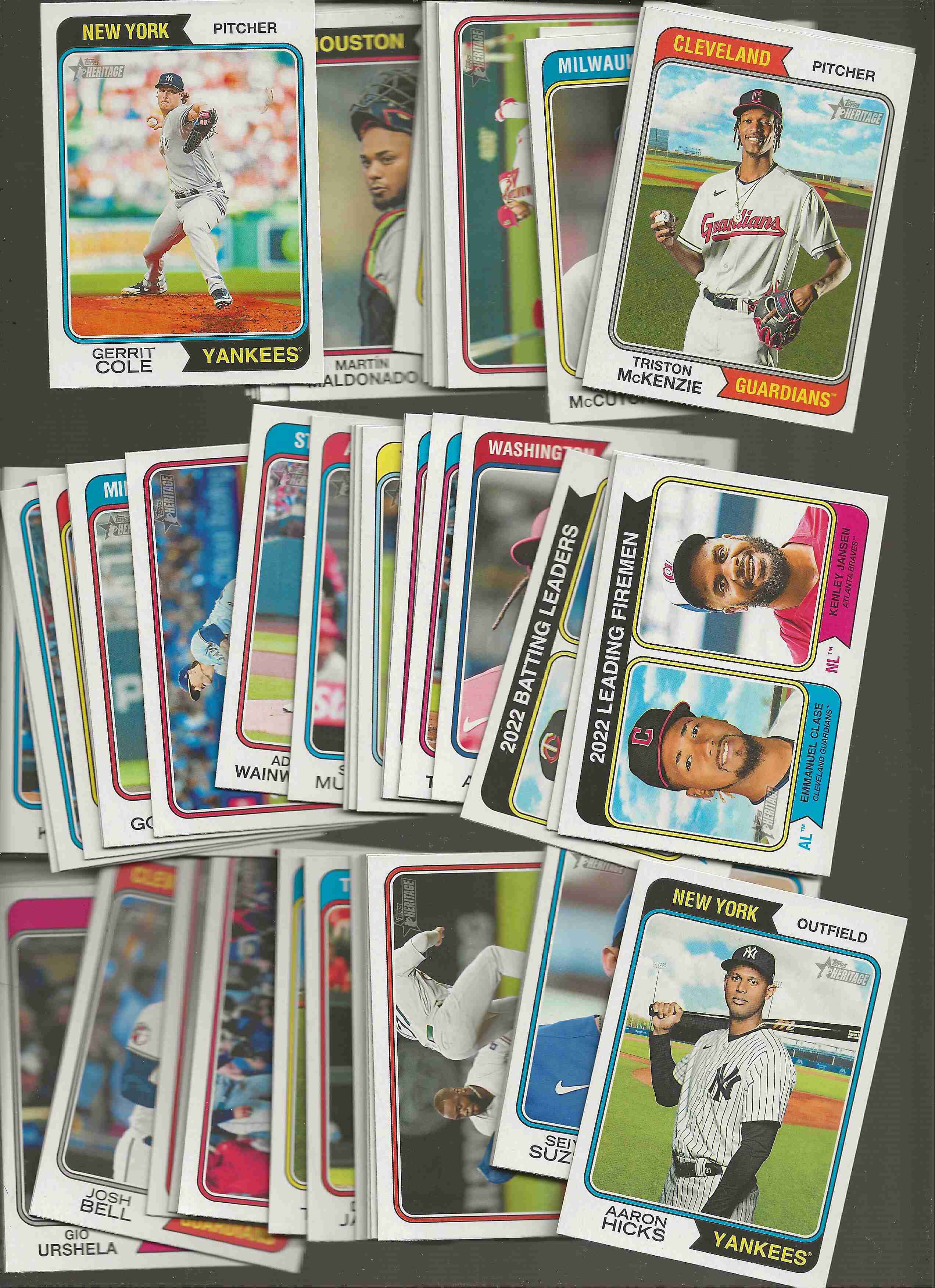 Turkey Red closeout 2010 and 2020 78-cards. 2023 Topps Heritage (1974 version) 72-cards Numbers are #10 38 38 41 41 50 59 60 71 75 79 92 101 120 126 141 155 161 175 177 177 184 184 184 185 186 197 201 204 208 214 219 222 223 234 239 239 243 243 245 245 249 349 255 255 256 260 269 279 283 285 291 296 297 297 299 324 329 335 347347 362 362 363 385 389 392 395 396 397 398 399. 2002 Topps Pristine 30-cards. 2009 Topps Closeout 137-cards