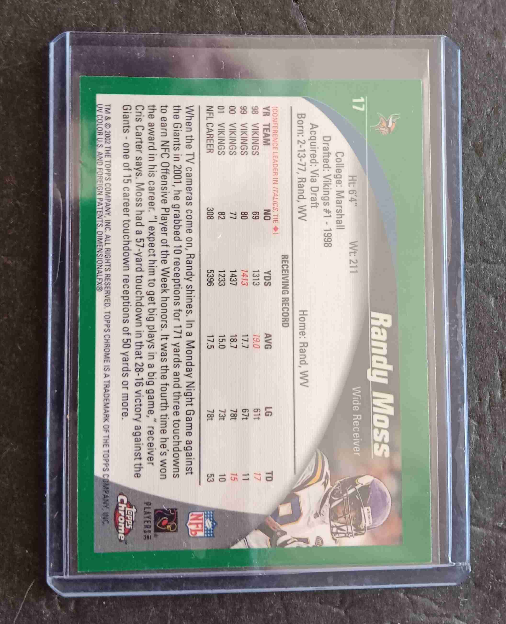 This auction is for a 2002 Topps Chrome Randy Moss.Card is number #17,and is in NM condition.Thanks for looking.