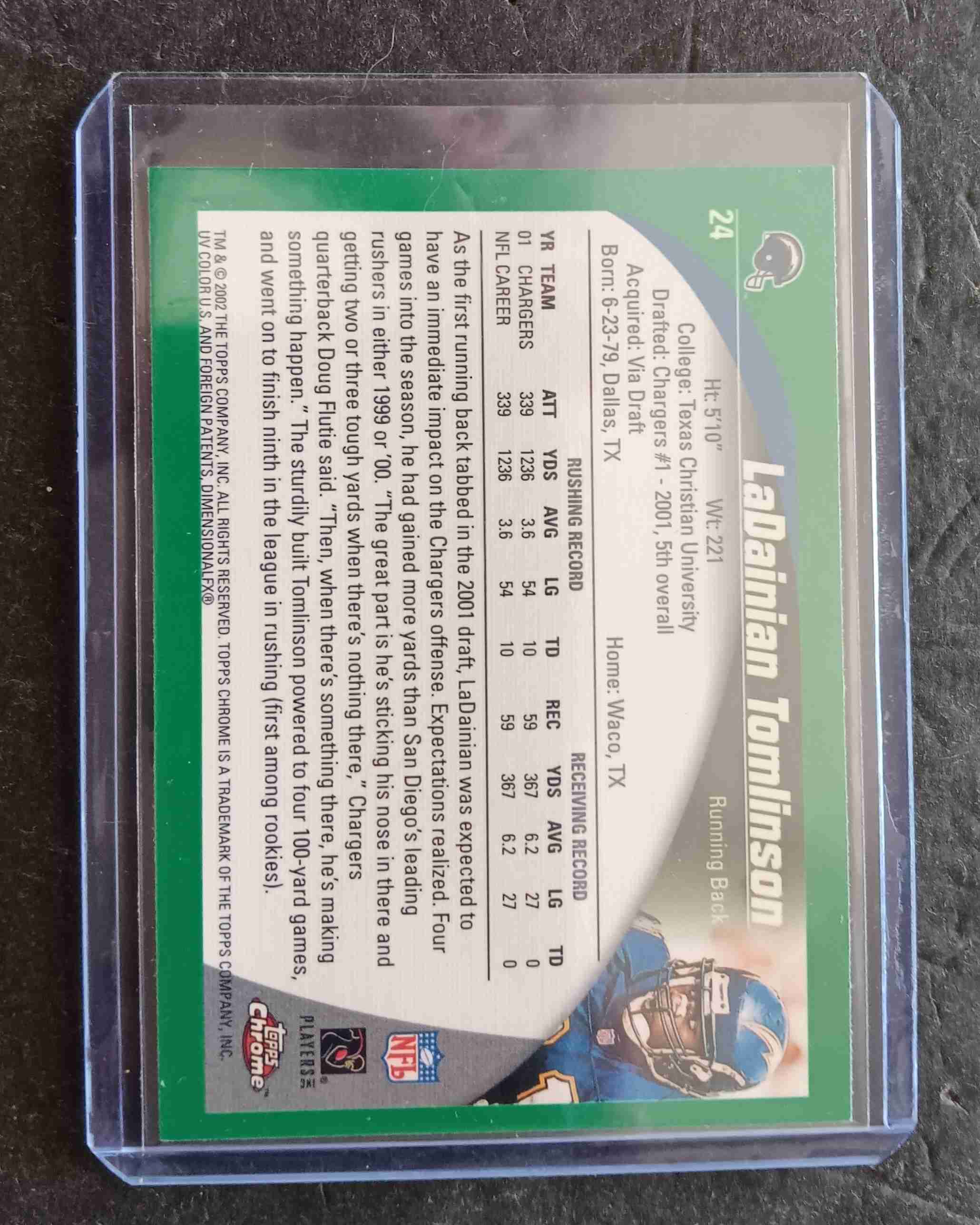 This auction is for a 2002 Topps Chrome LaDainian Tomlinson.Card is number #24,and is in NM condition.Thanks for looking.